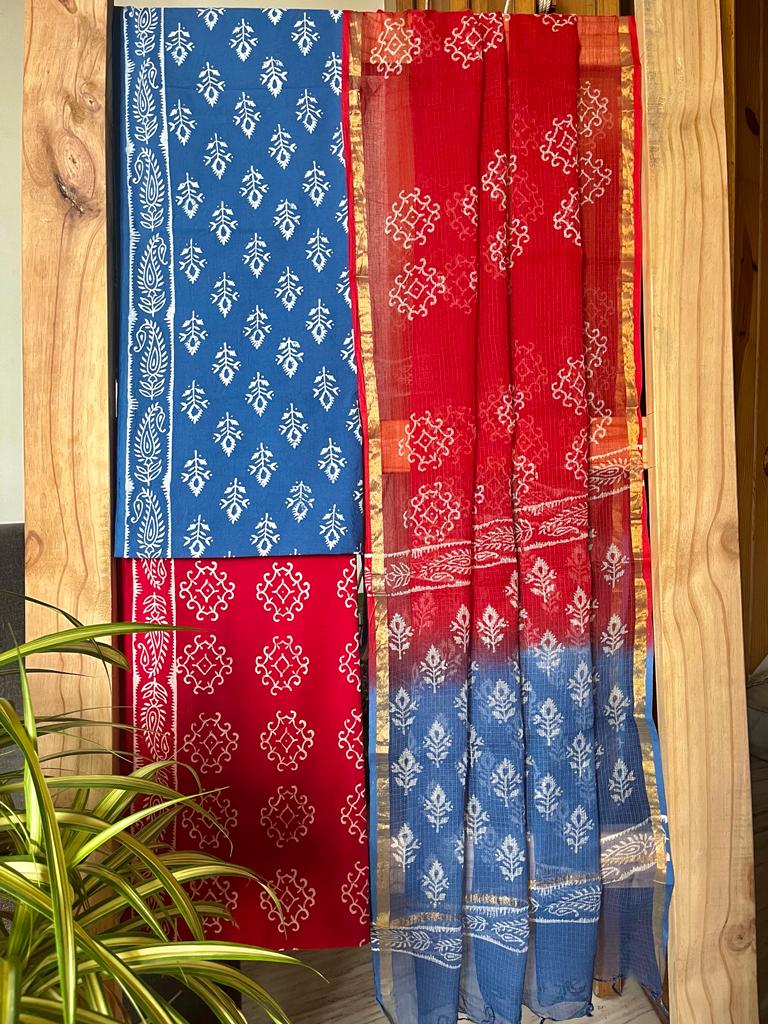 handblock printed pure cotton suits with kota doriya dupatta