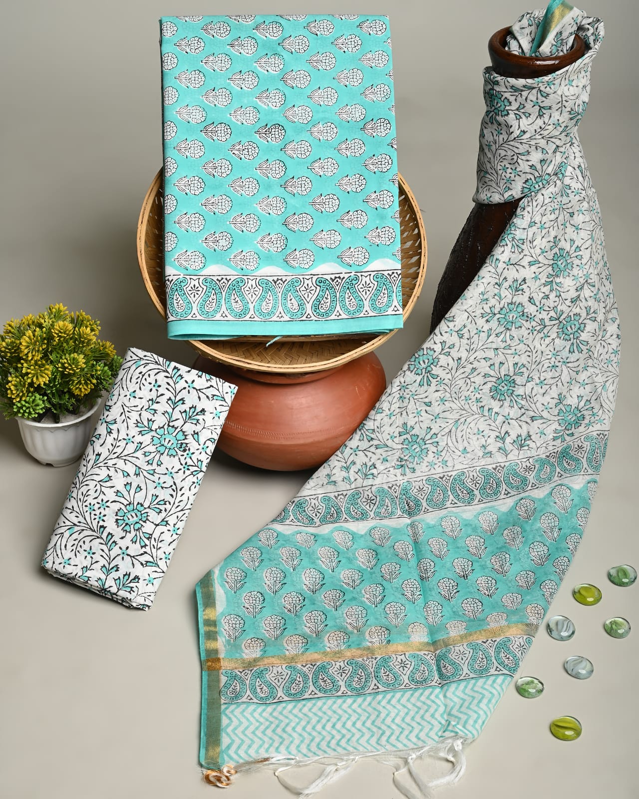 Cotton Tie work suit material with cotton dupatta and Gotta neck work