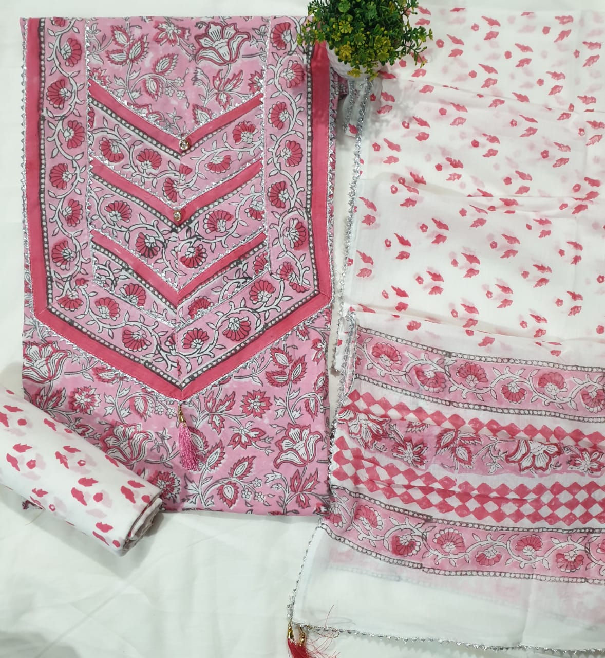 Beautiful Bagru block-printed pure cotton suit sets with detailed jaipuri gota patti handwork.