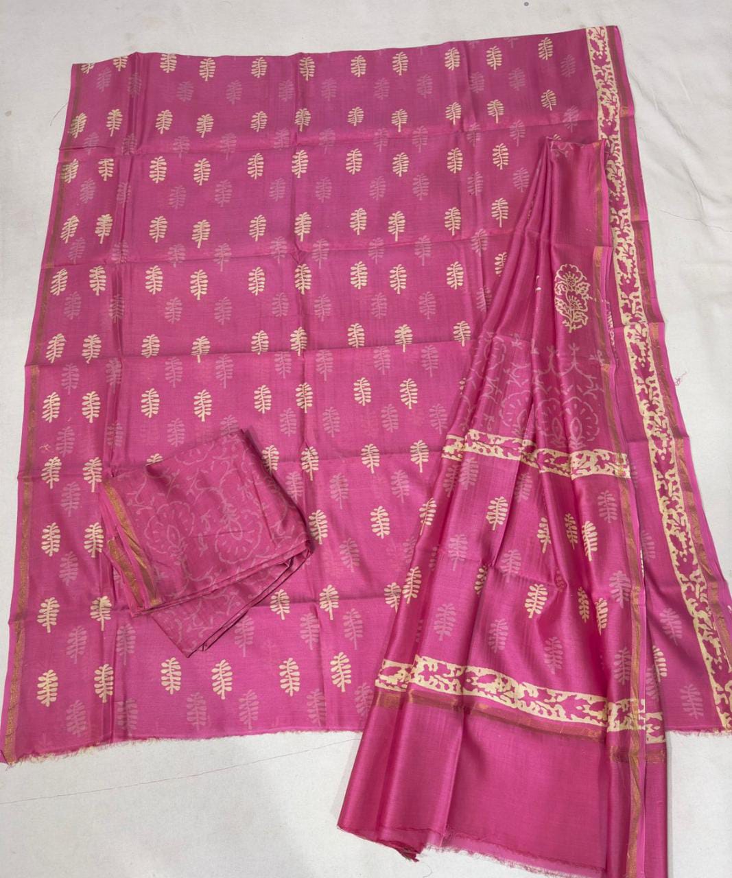 Beautiful hand block vegetable dye mulbury print chanderi complete dress material.