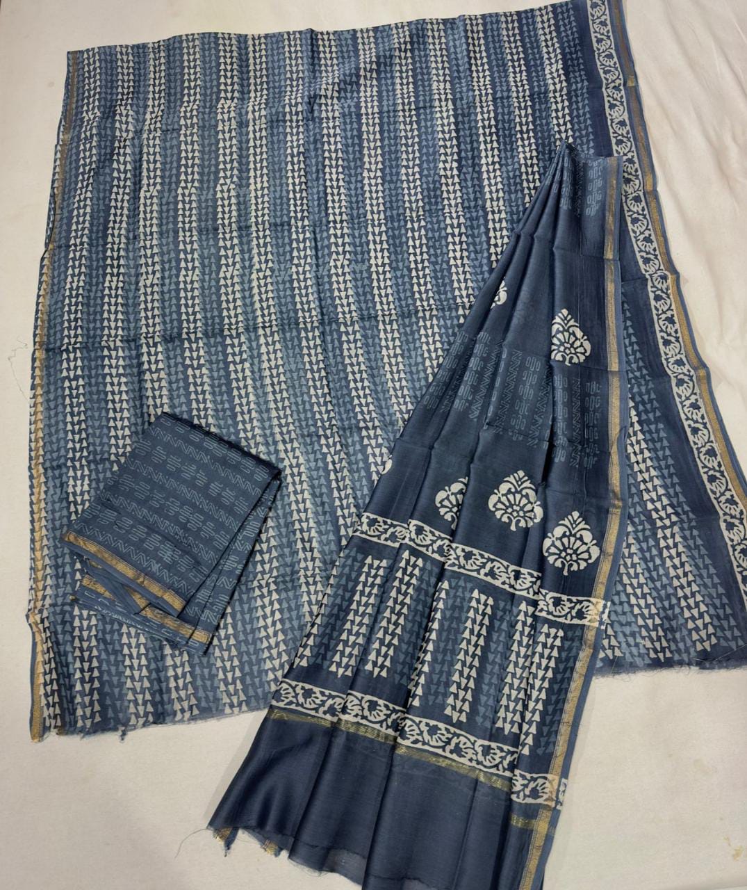 Beautiful hand block vegetable dye mulbury print chanderi complete dress material.