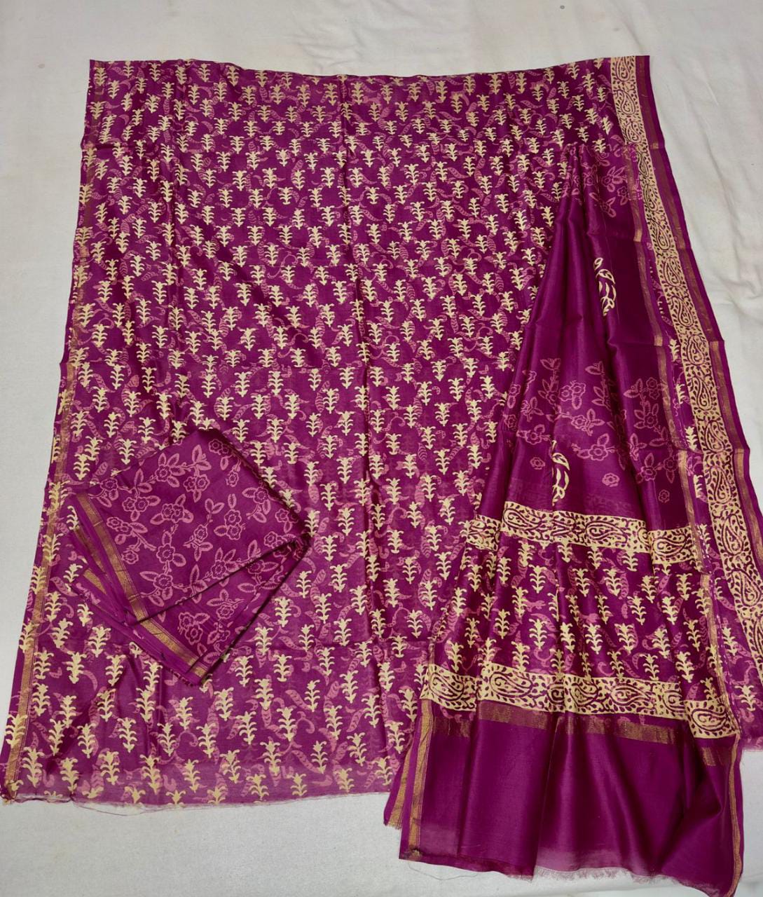 Beautiful hand block vegetable dye mulbury print chanderi complete dress material.