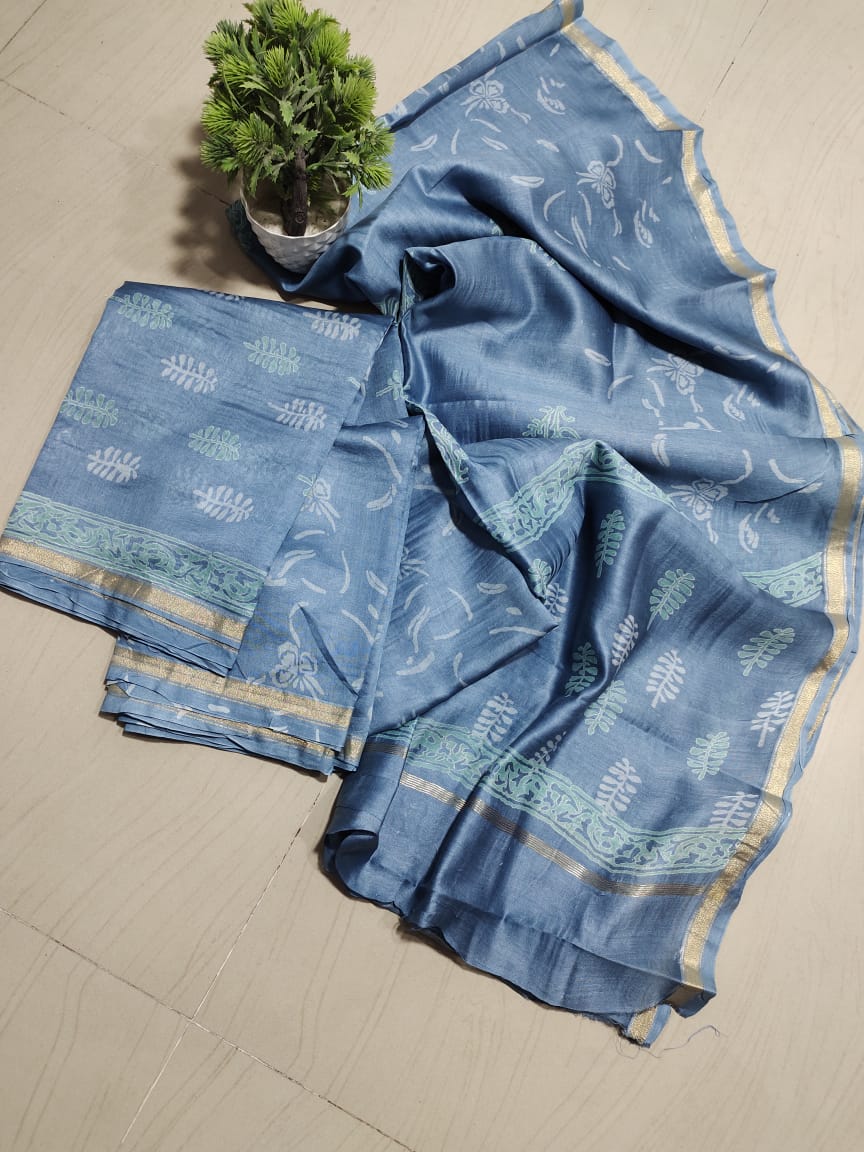 Beautiful handblock attractive Mulwari print silk by cotton chanderi complete dress material