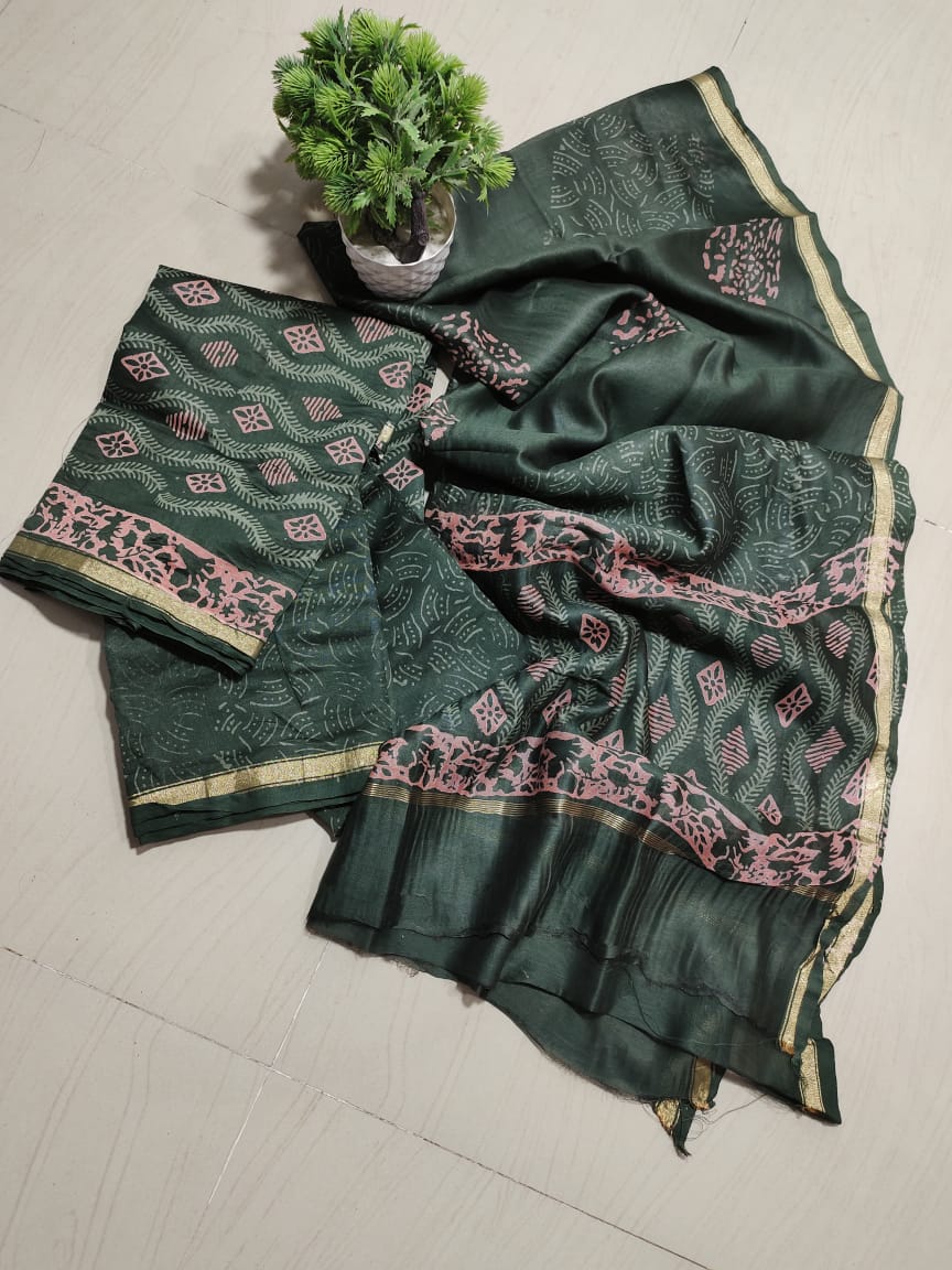 Beautiful handblock attractive Mulwari print silk by cotton chanderi complete dress material