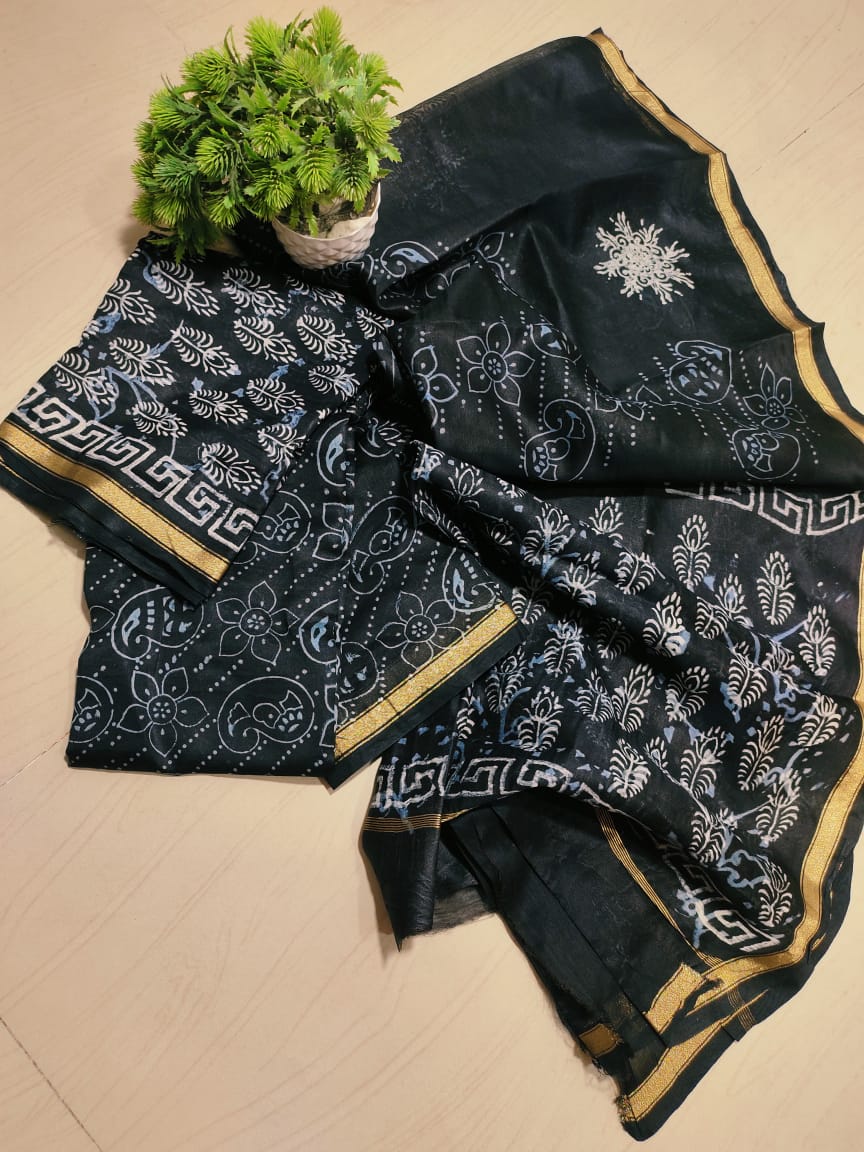 Beautiful handblock attractive Mulwari print silk by cotton chanderi complete dress material