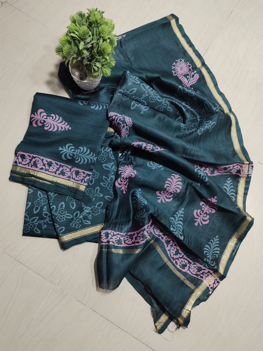 Beautiful handblock attractive Mulwari print silk by cotton chanderi complete dress material