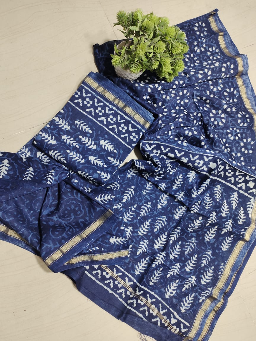 Beautiful handblock attractive soft silk indigo print chanderi complete dress material with golden jari piping boder