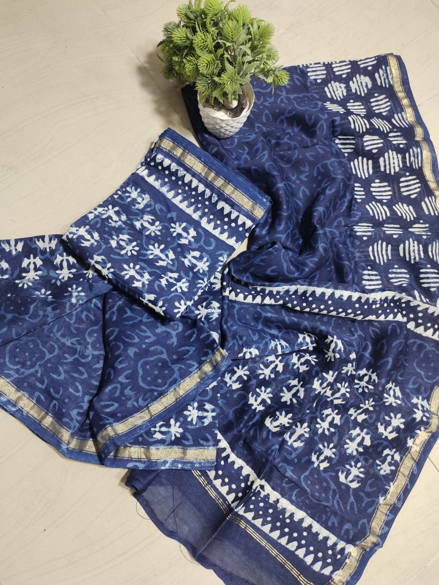 Beautiful handblock attractive soft silk indigo print chanderi complete dress material with golden jari piping boder