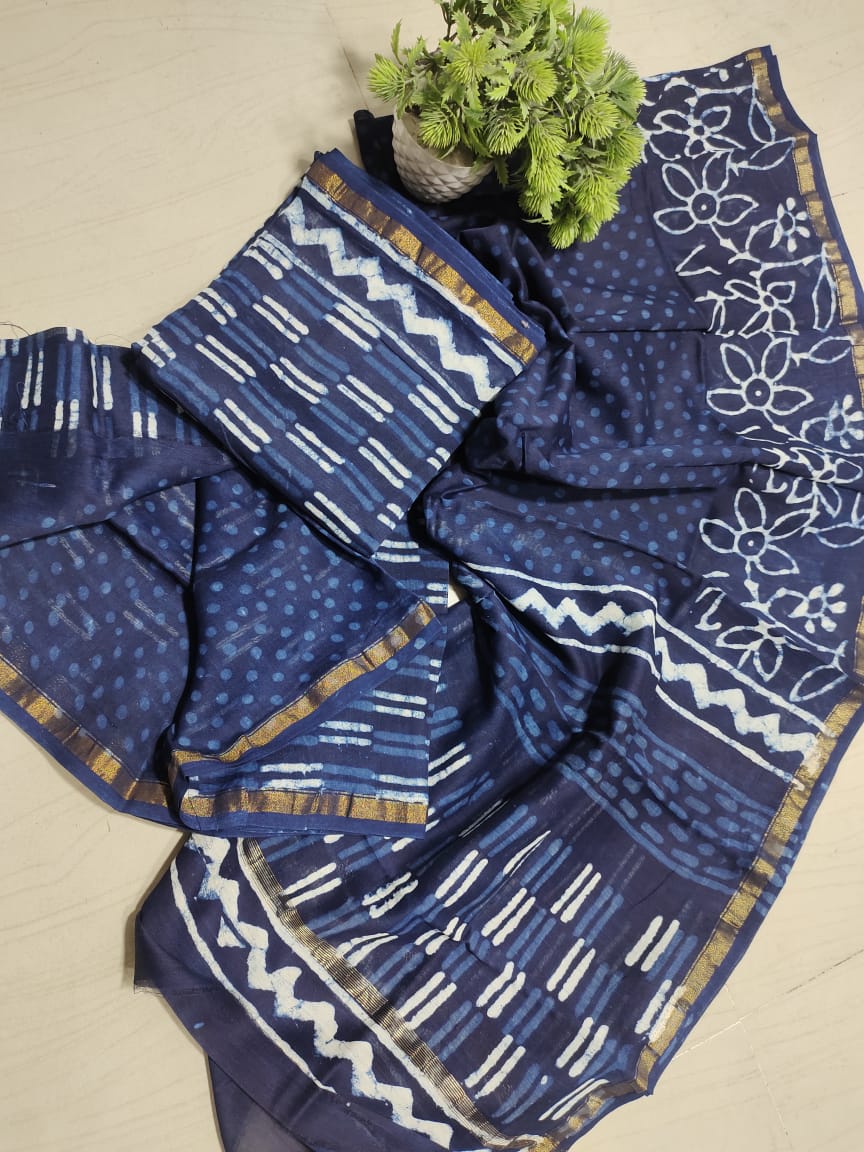 Beautiful handblock attractive soft silk indigo print chanderi complete dress material with golden jari piping boder