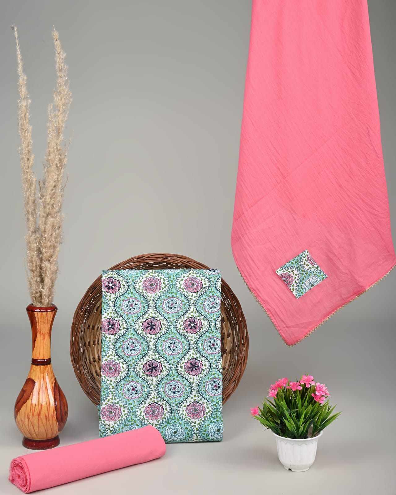 Beautiful Sanganeri print cotton hand work suit material with cotton dupatta