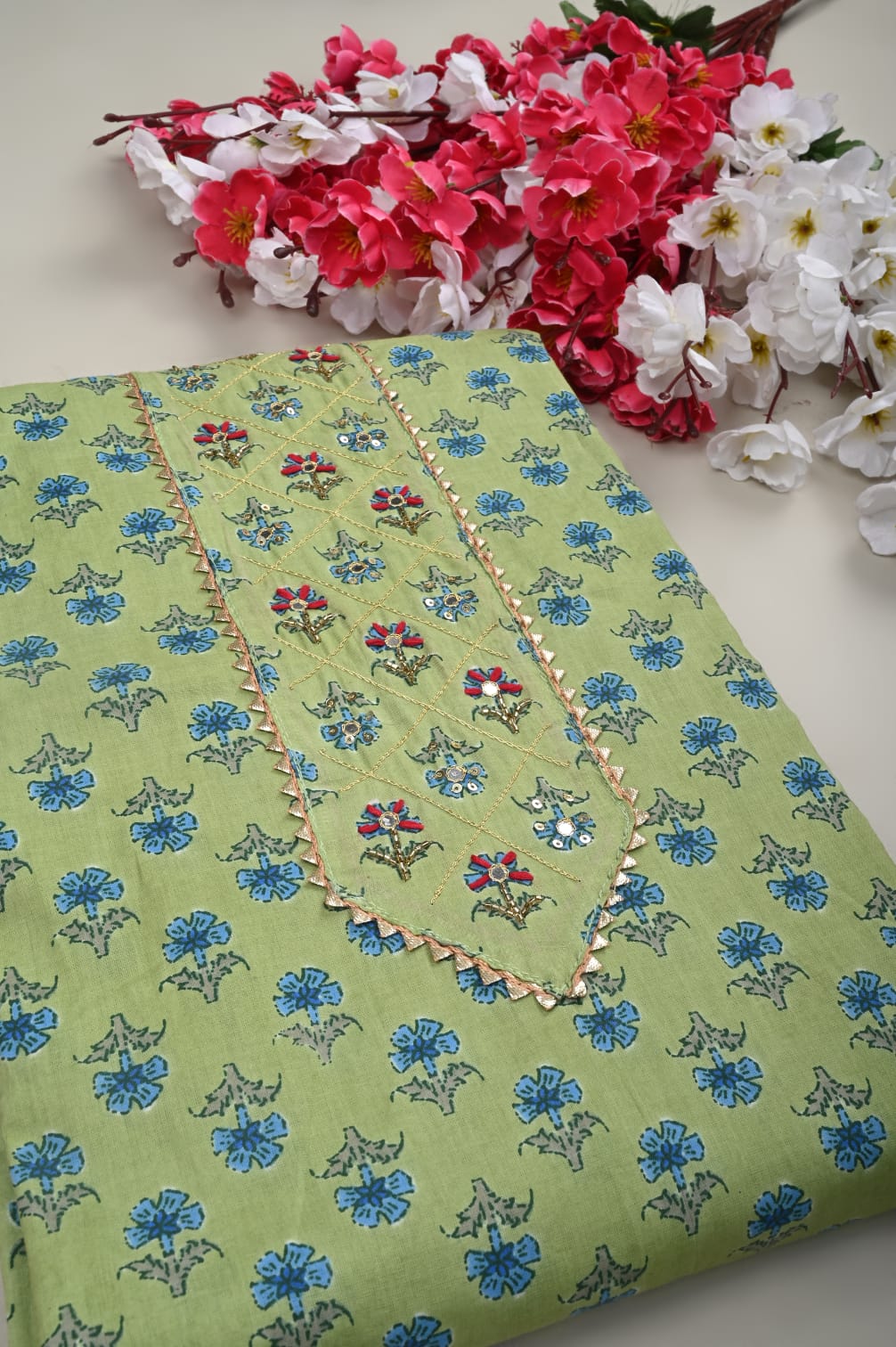 Beautiful Sanganeri print cotton hand work suit material with cotton dupatta and Hand work on neck