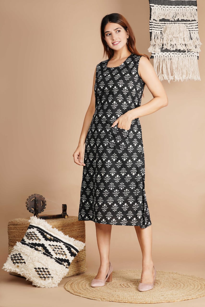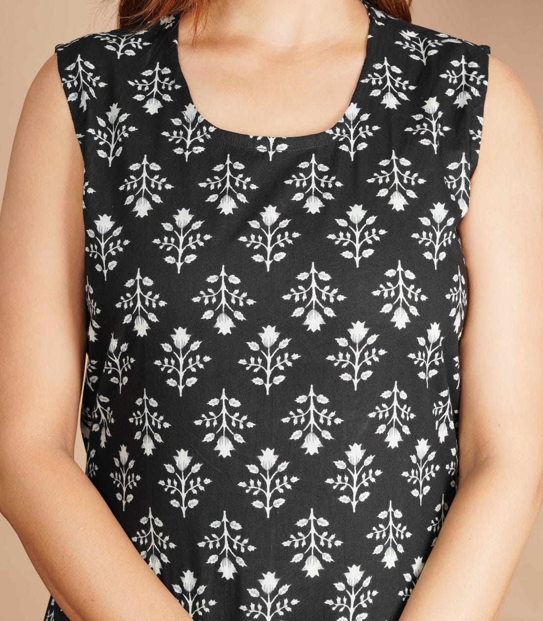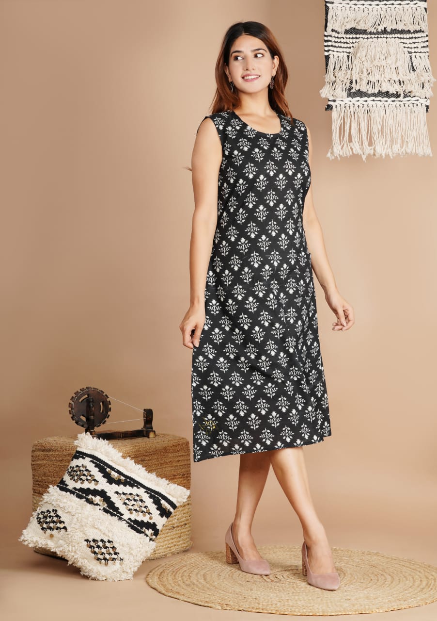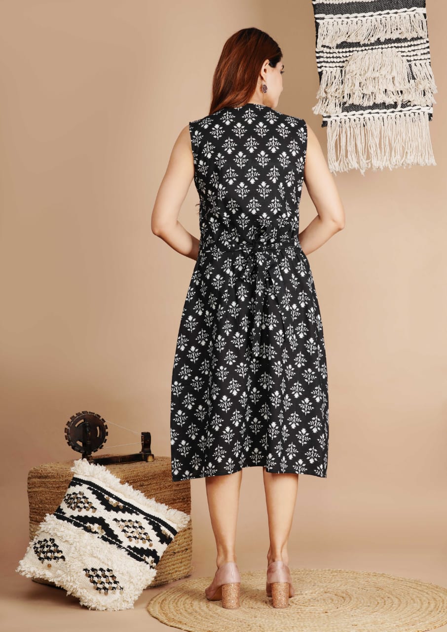 HomeAll Categories Black Pure Cotton Hand Block Tunic With Pockets and back Belt