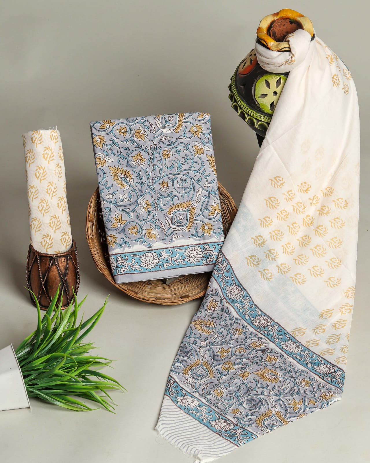 Block Printed Pure Cotton Suit Sets With Cotton Mulmul Dupatta.
