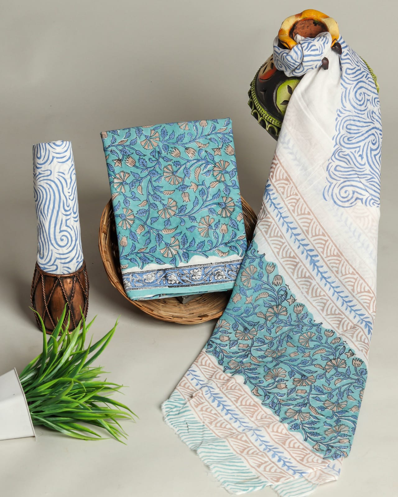 Block Printed Pure Cotton Suit Sets With Cotton Mulmul Dupatta.