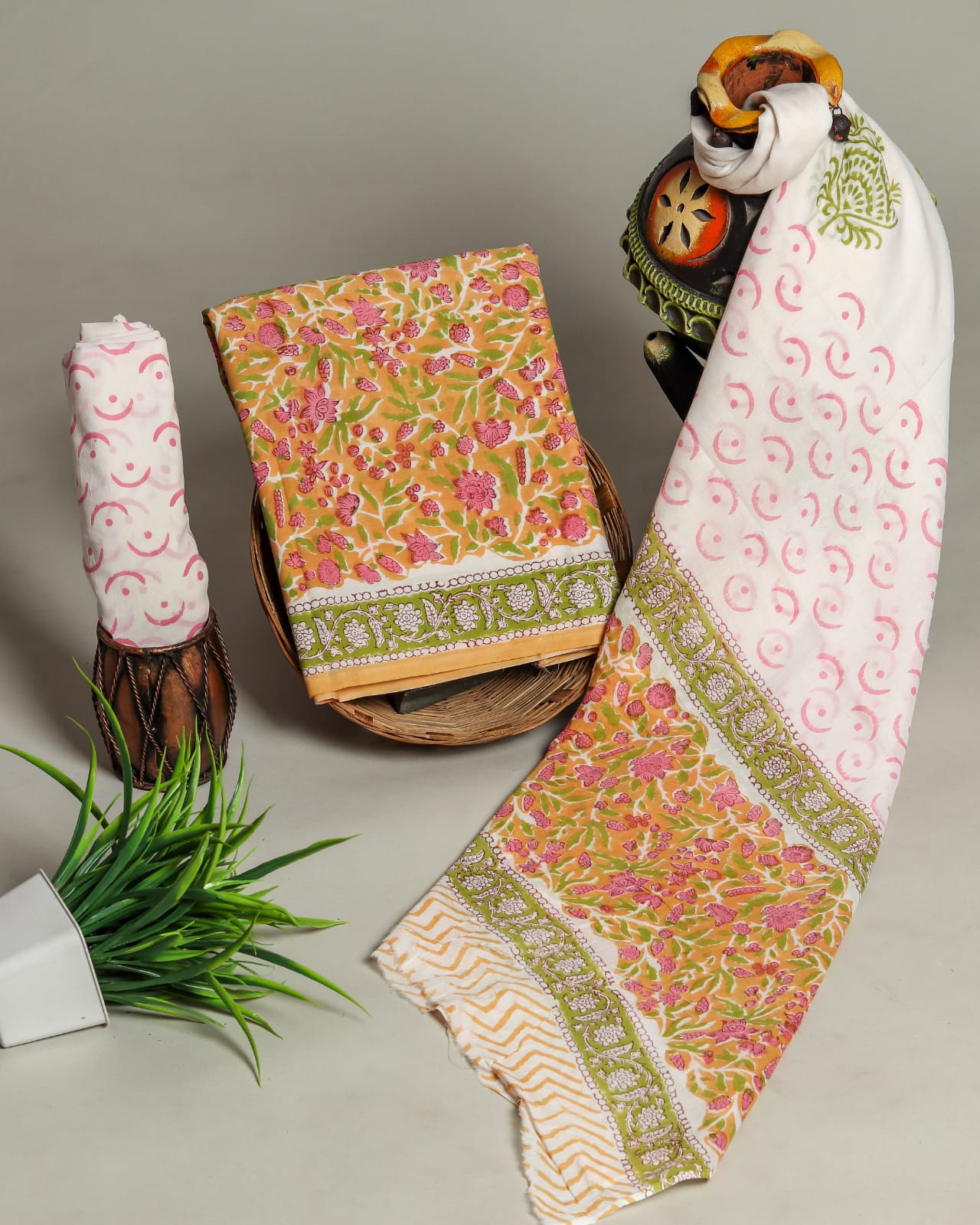 Block Printed Pure Cotton Suit Sets With Cotton Mulmul Dupatta.