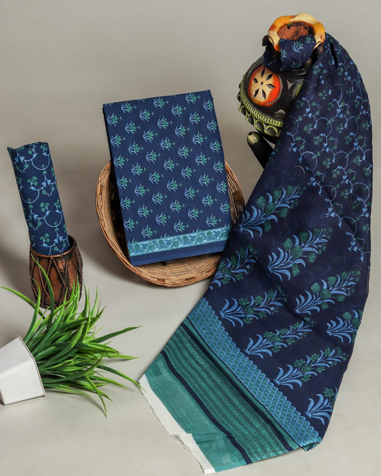 Block Printed Pure Cotton Suit Sets With Cotton Mulmul Dupatta.