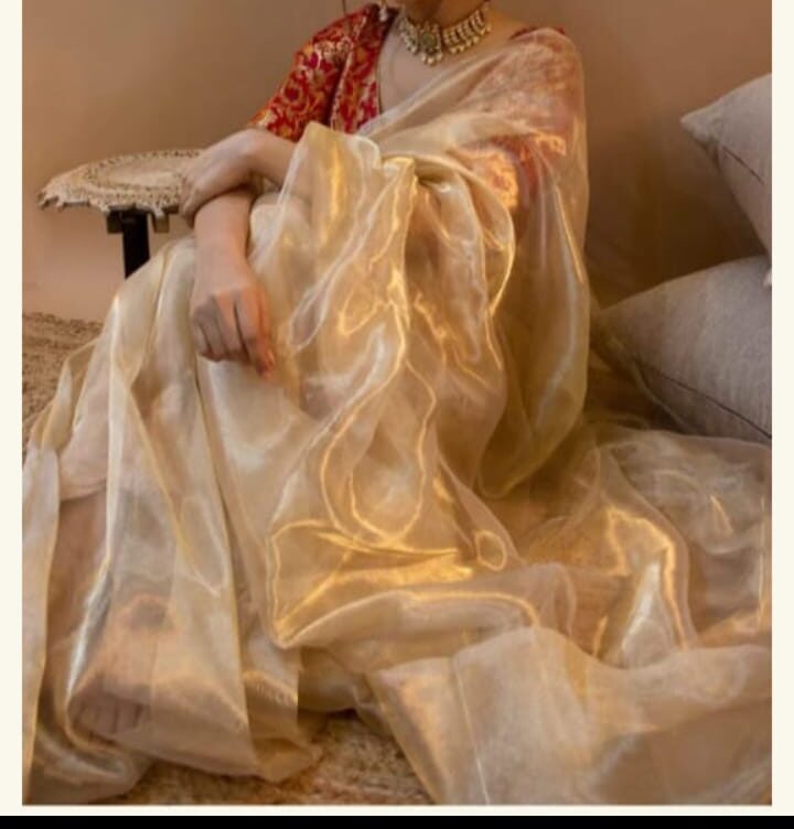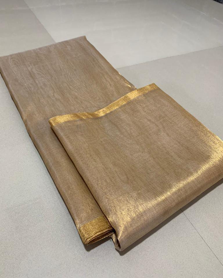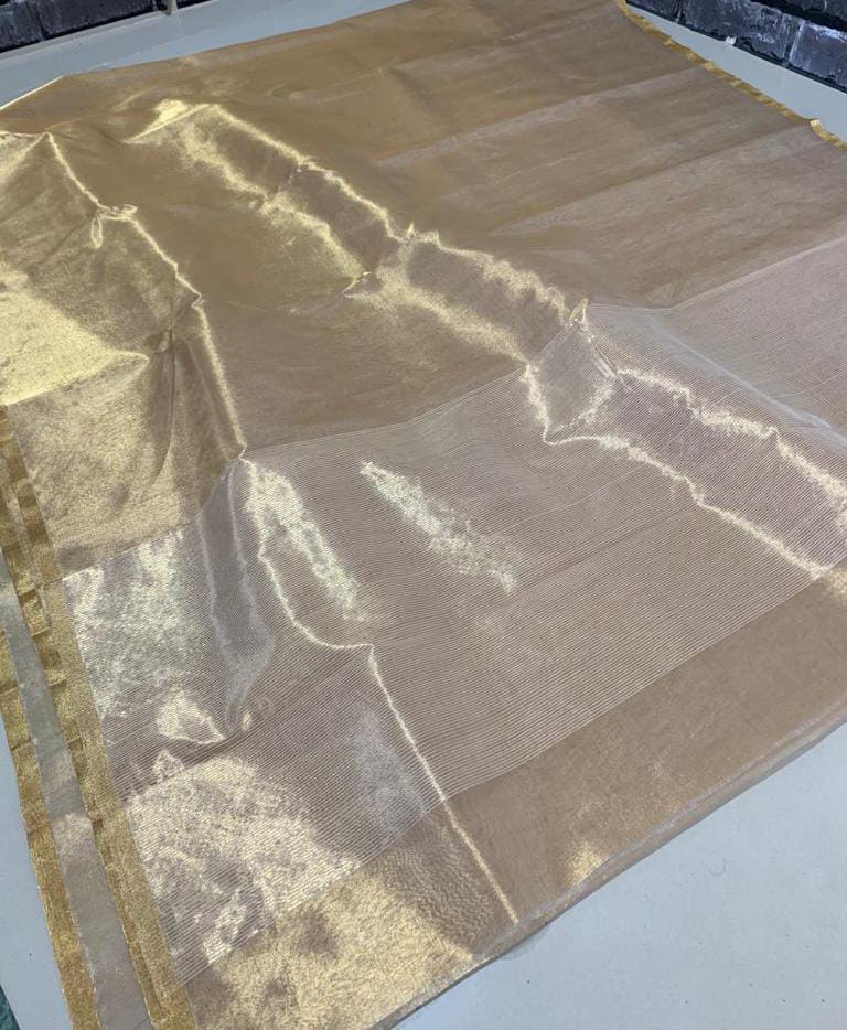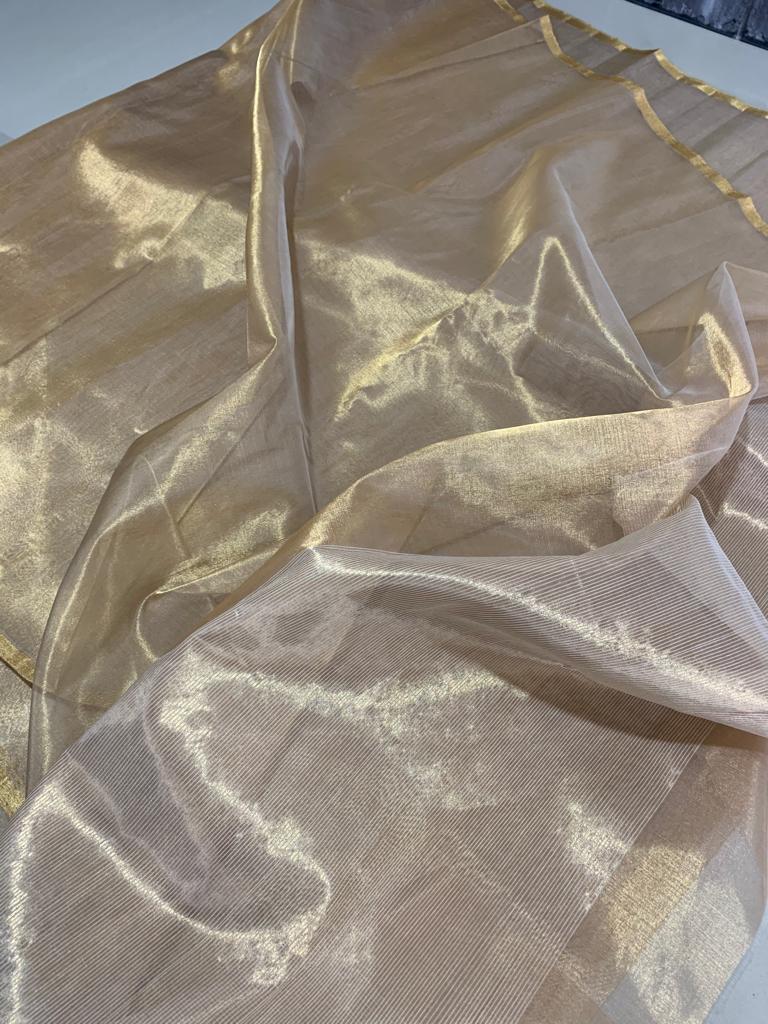 Allover beautiful golden Zari hand-woven chanderi tissue With golden zari solid small border & Fancy stripe pallu