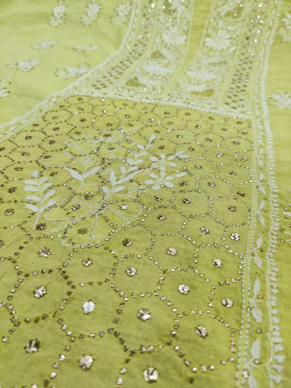 Beautiful Chanderi cotton Fabric superfine Chikankari handwork kurta dupatta set heaving intricate Chikankari embroidery 🪡 with beautiful heavy Mukaish MAAHI JAAL done with dupatta on same fabric Done with 4side Border & small booties with Chikankari embellished with Mukaish (Badla) work done as well.