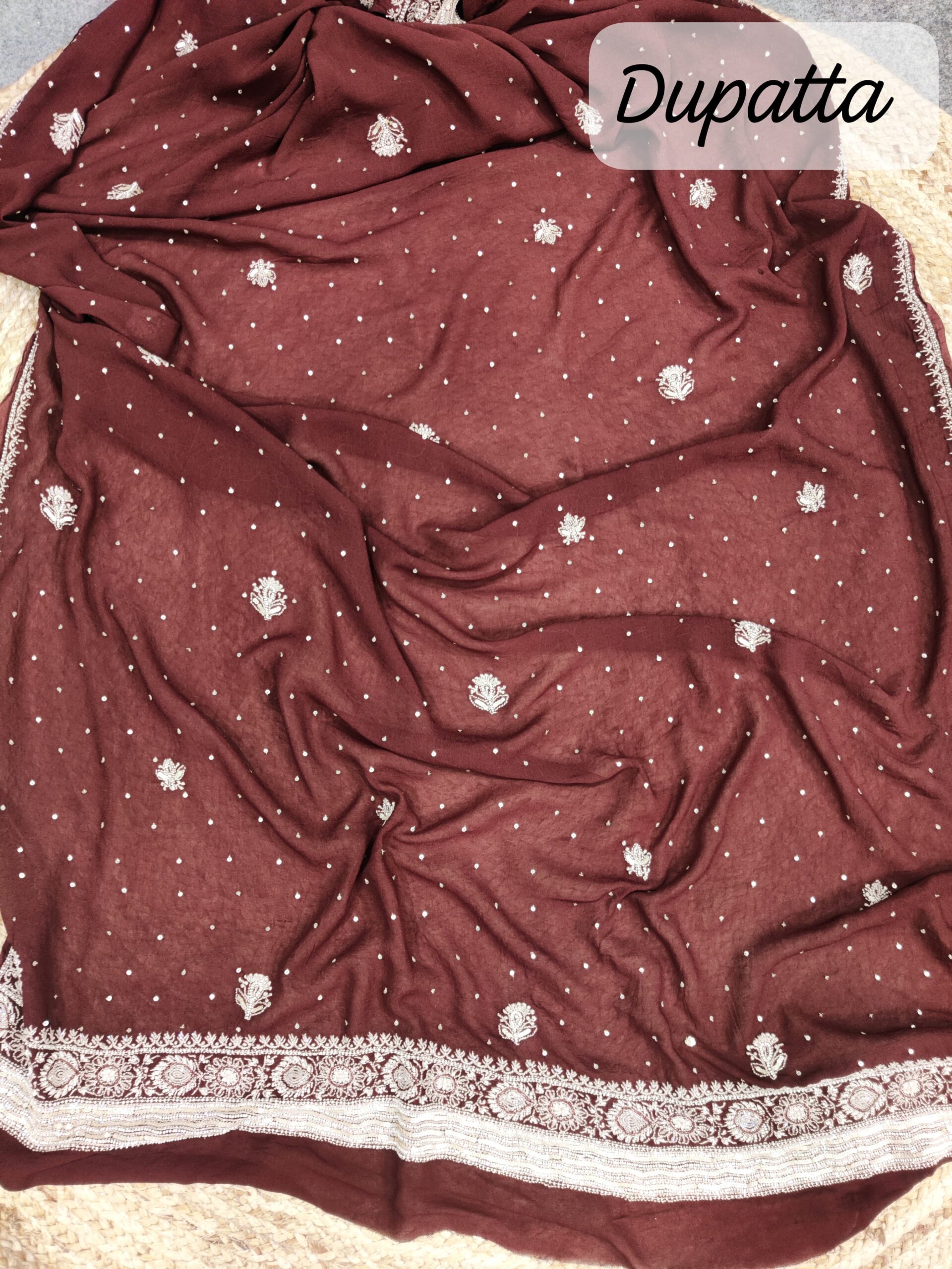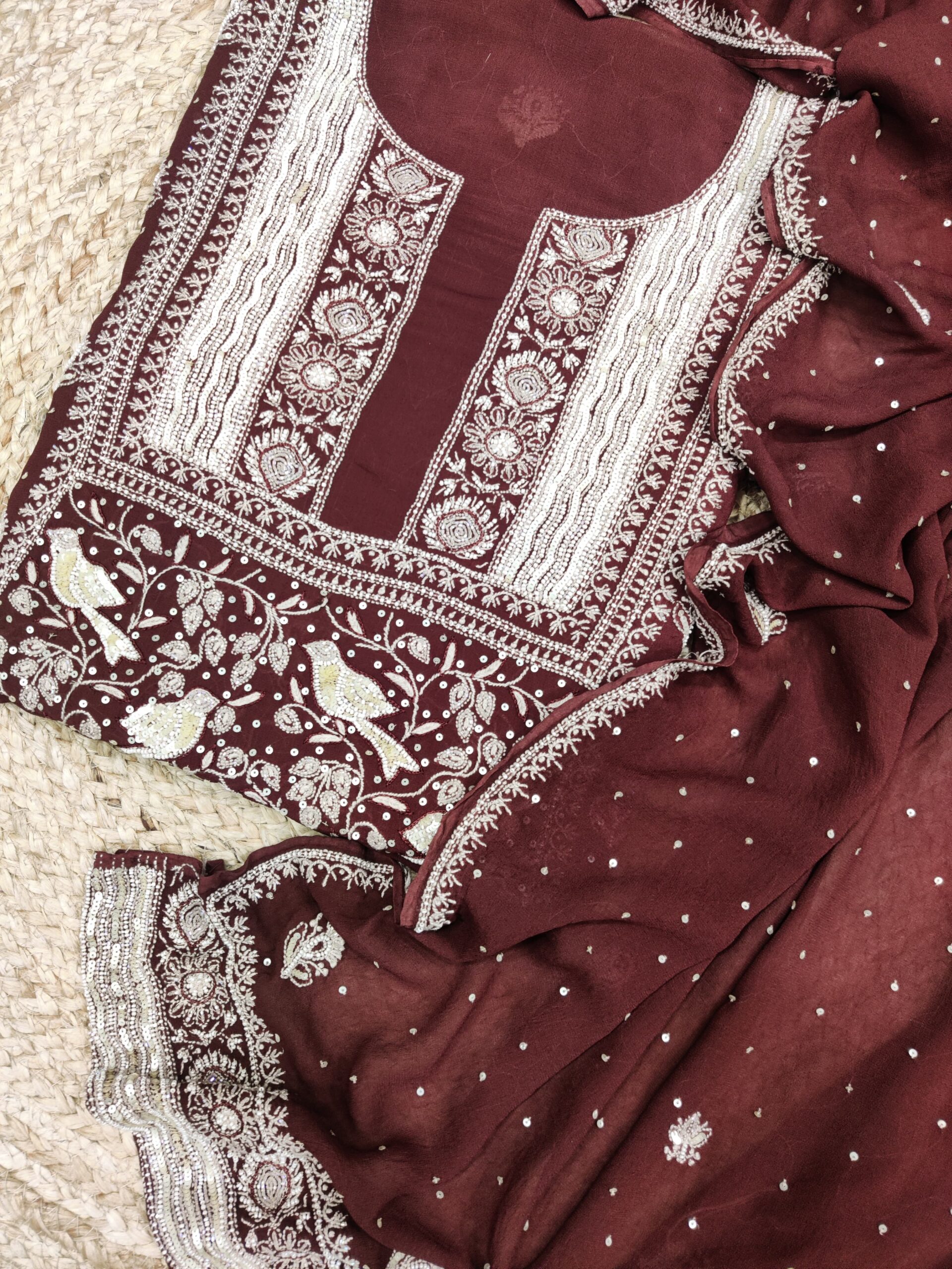 coffee Brown Pure Georgette Chikankari Straight Kurta & dupatta set, features beautifully crafted🪡 allover Sequins jaal embroidered on the front and back, paired with a heavy embroidered dupatta.