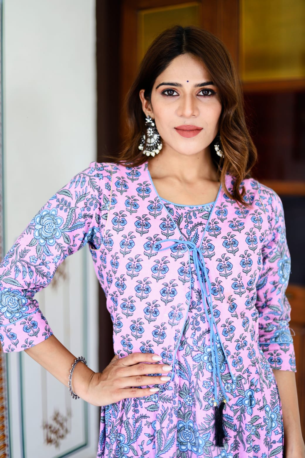 Bagru Handblock printed Cotton designer Anarkali Dress with Double layered Short Jacket available..( Set of 2 piece)