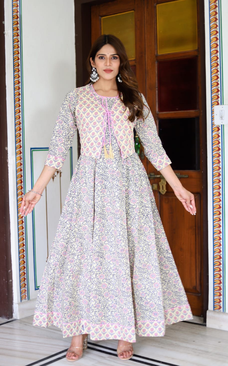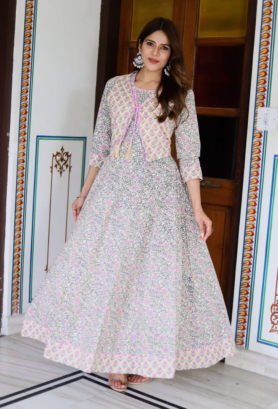 Bagru Handblock printed Cotton designer Anarkali Dress with Double layered Short Jacket available..( Set of 2 piece)