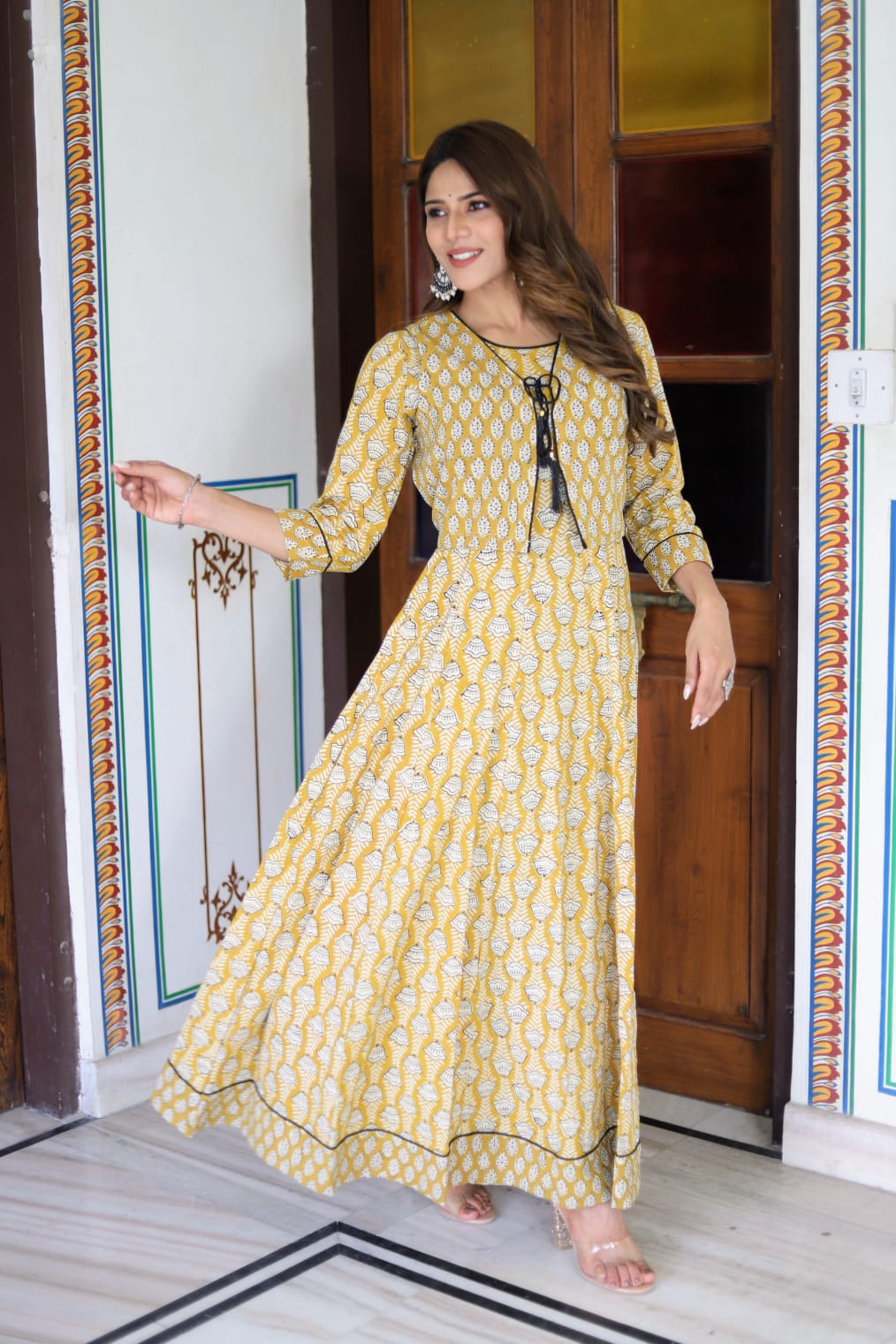 Bagru Handblock printed Cotton designer Anarkali Dress with Double layered Short Jacket available..( Set of 2 piece)