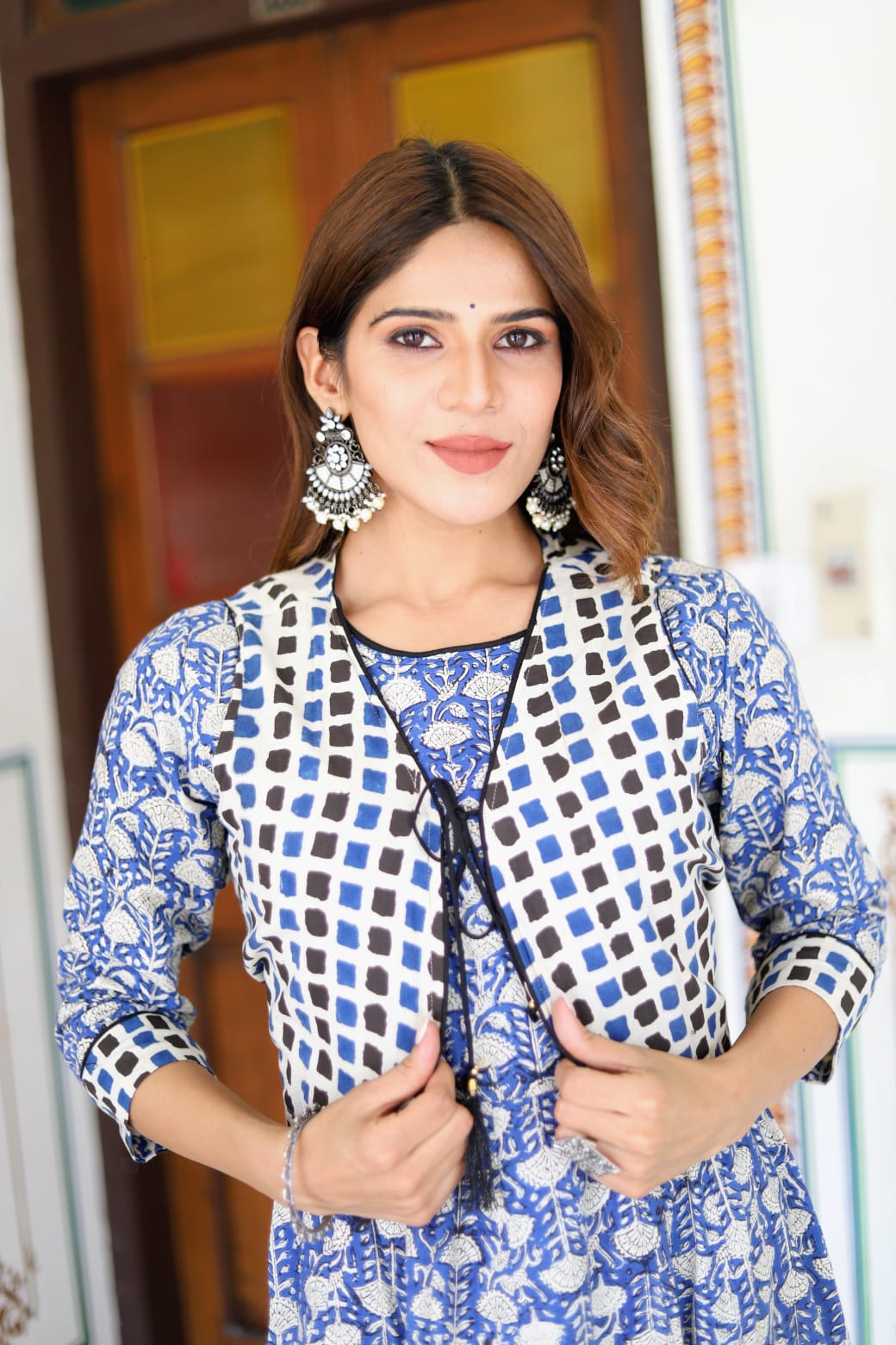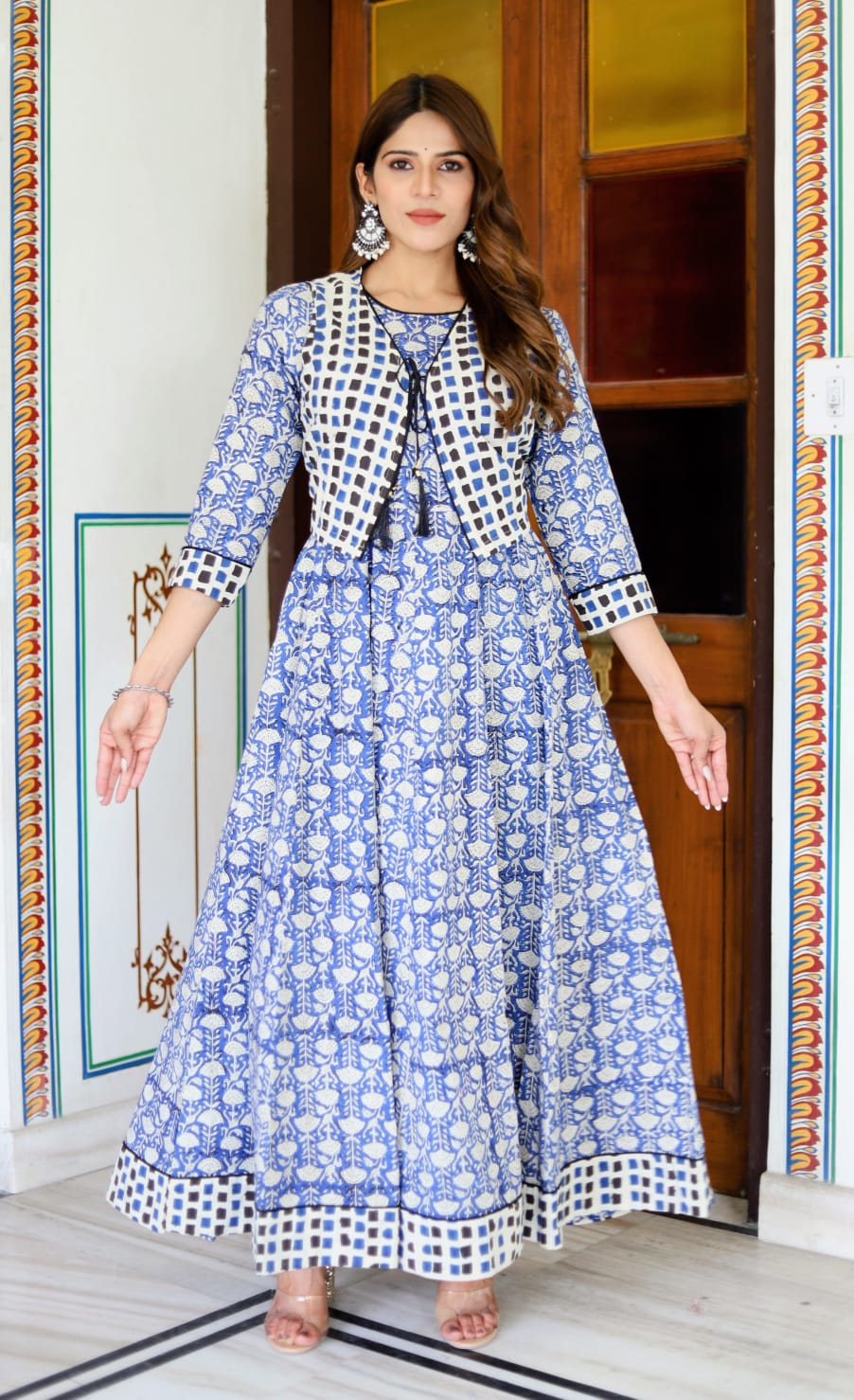 Bagru Handblock printed Cotton designer Anarkali Dress with Double layered Short Jacket available..( Set of 2 piece)