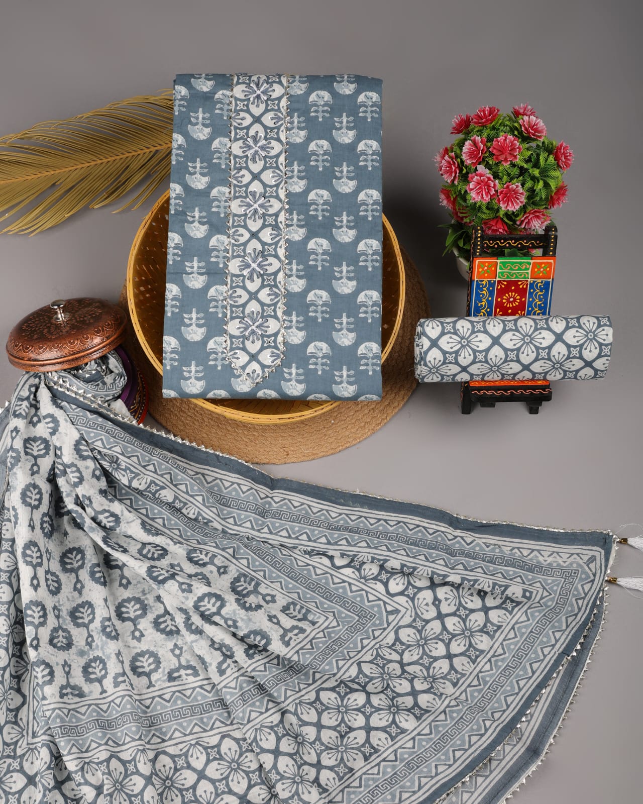 Cotton Tie work suit material with cotton dupatta and Gotta neck work