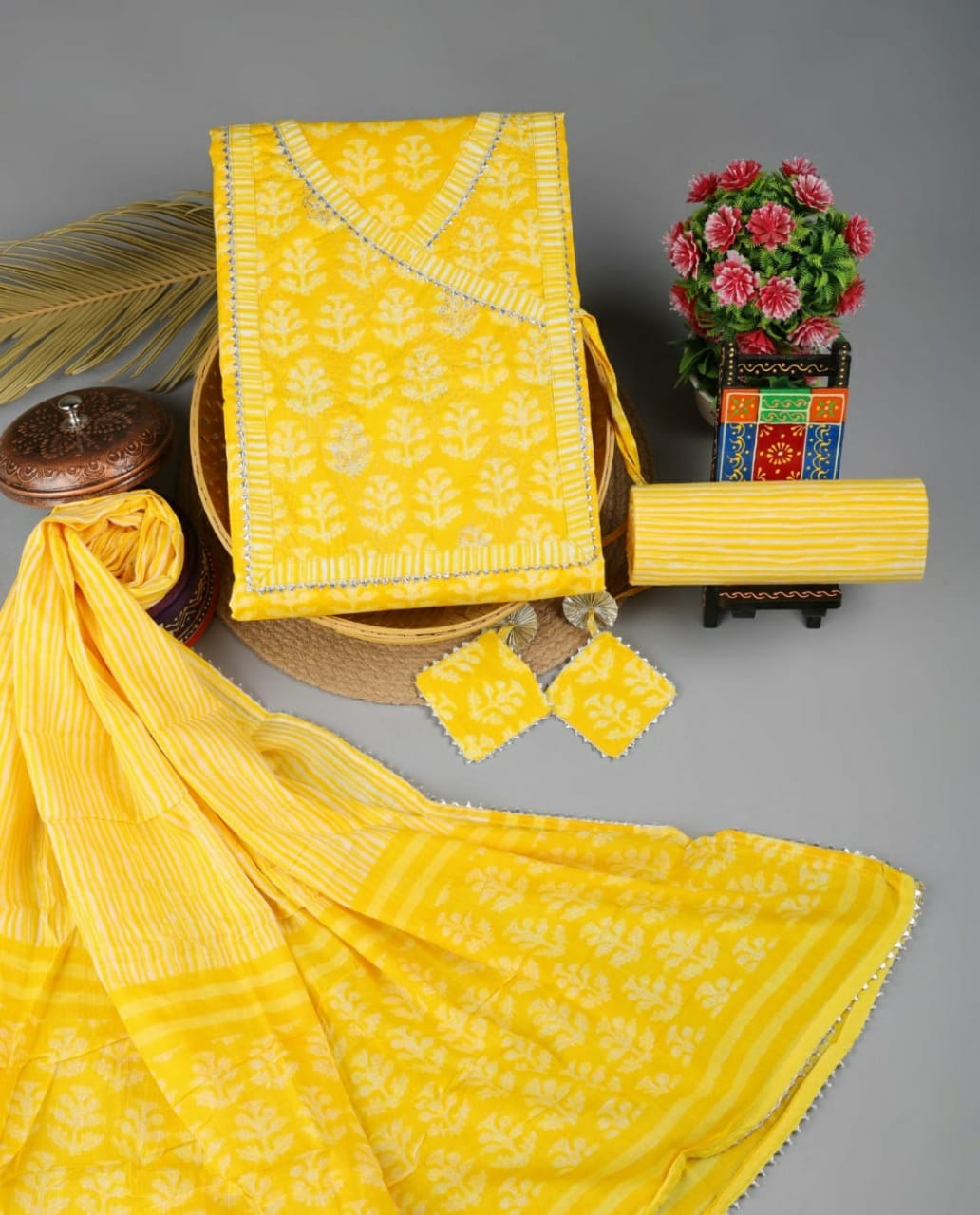 HomeCotton Suits With Gota Paati Work Cotton Tie work suit material with cotton dupatta and Gotta neck work