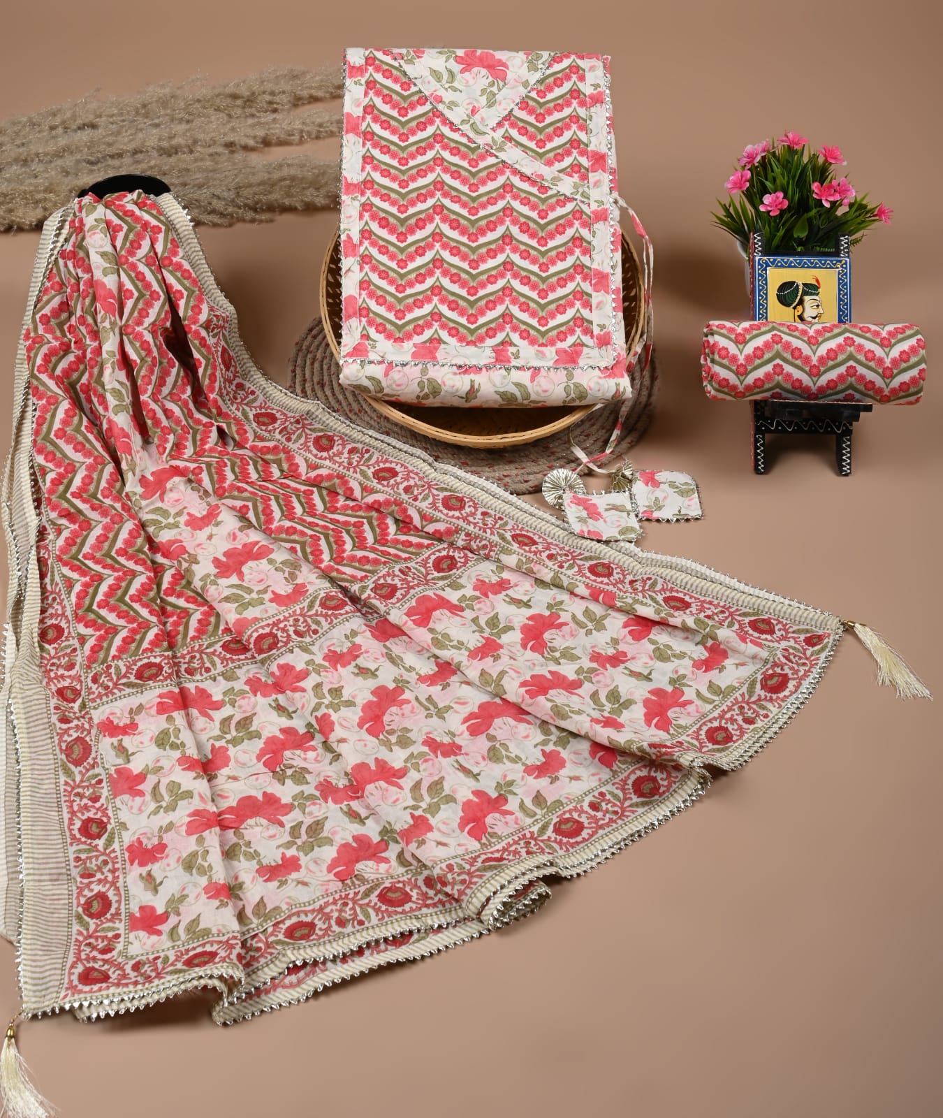 Cotton Tie work suit material with cotton dupatta and Gotta neck work