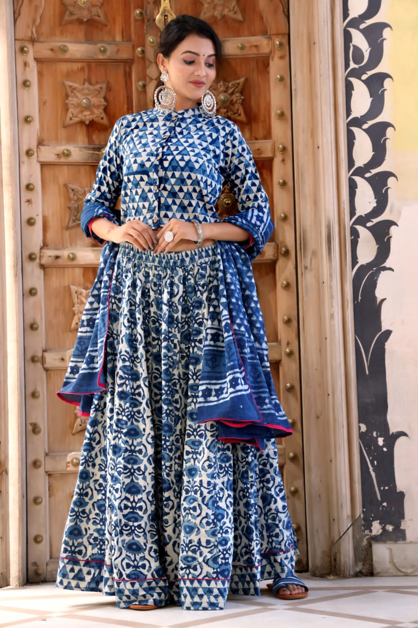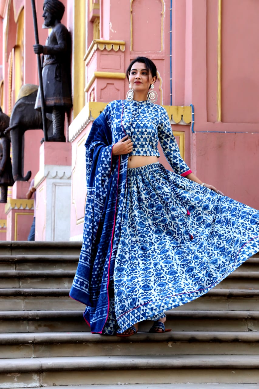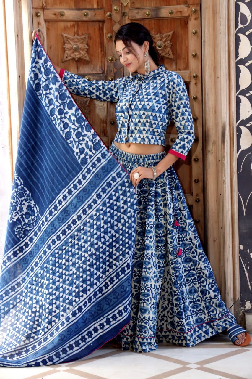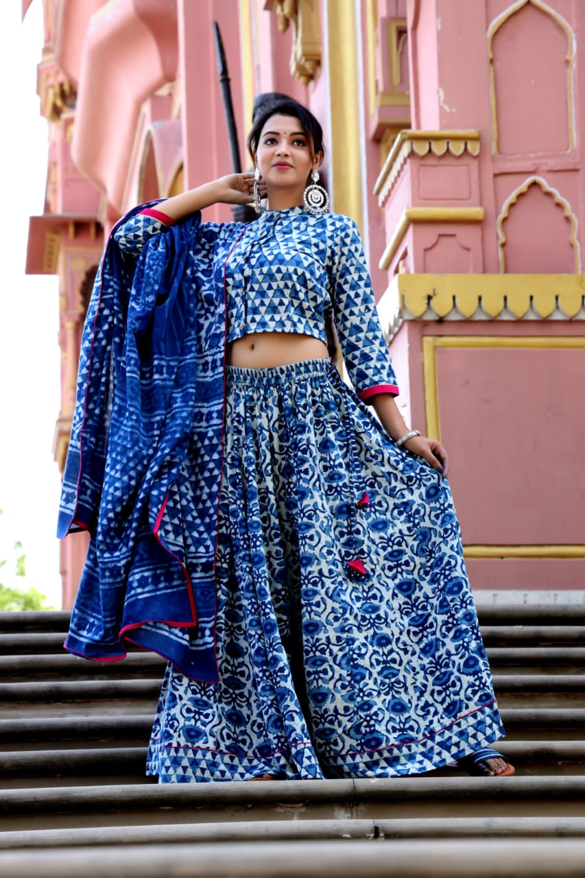 Dress with the Finest Cotton Bagru Printed Designer Top & Skirt with Mulmul Duptta (Lehenga Choli)