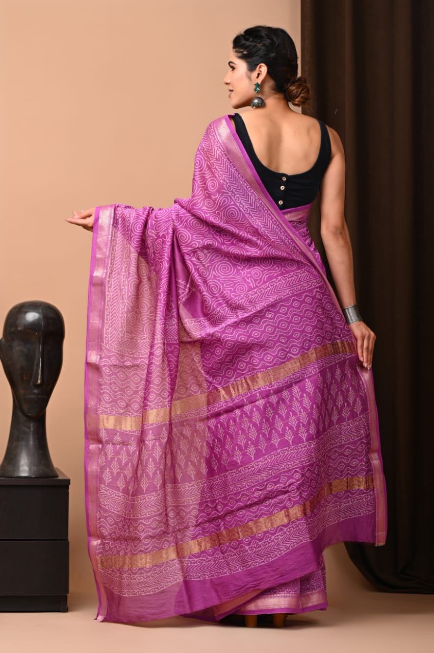 Elegant Maheshwari silk Saree with woven borders and beautiful Hand Block.