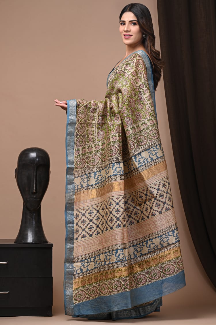 Elegant Maheshwari silk Saree with woven borders and beautiful Hand Block.