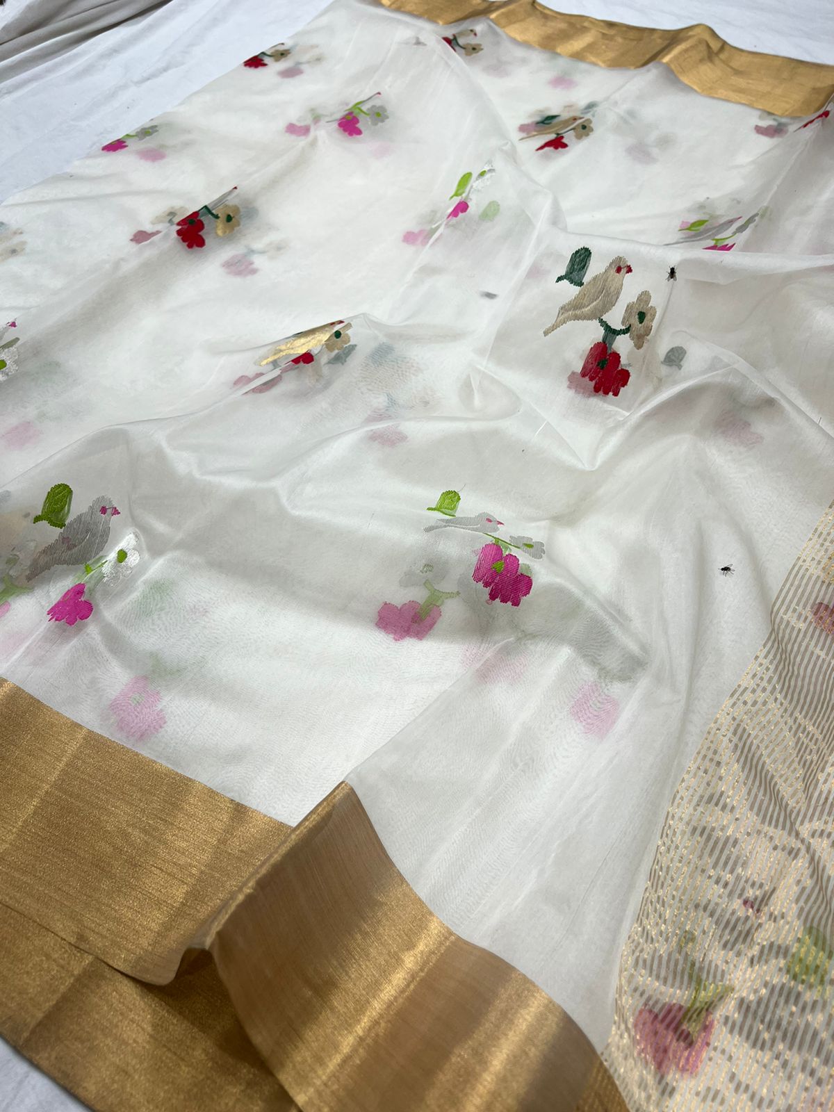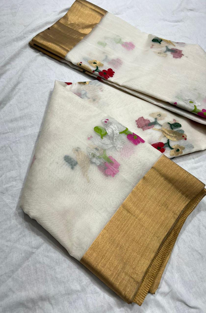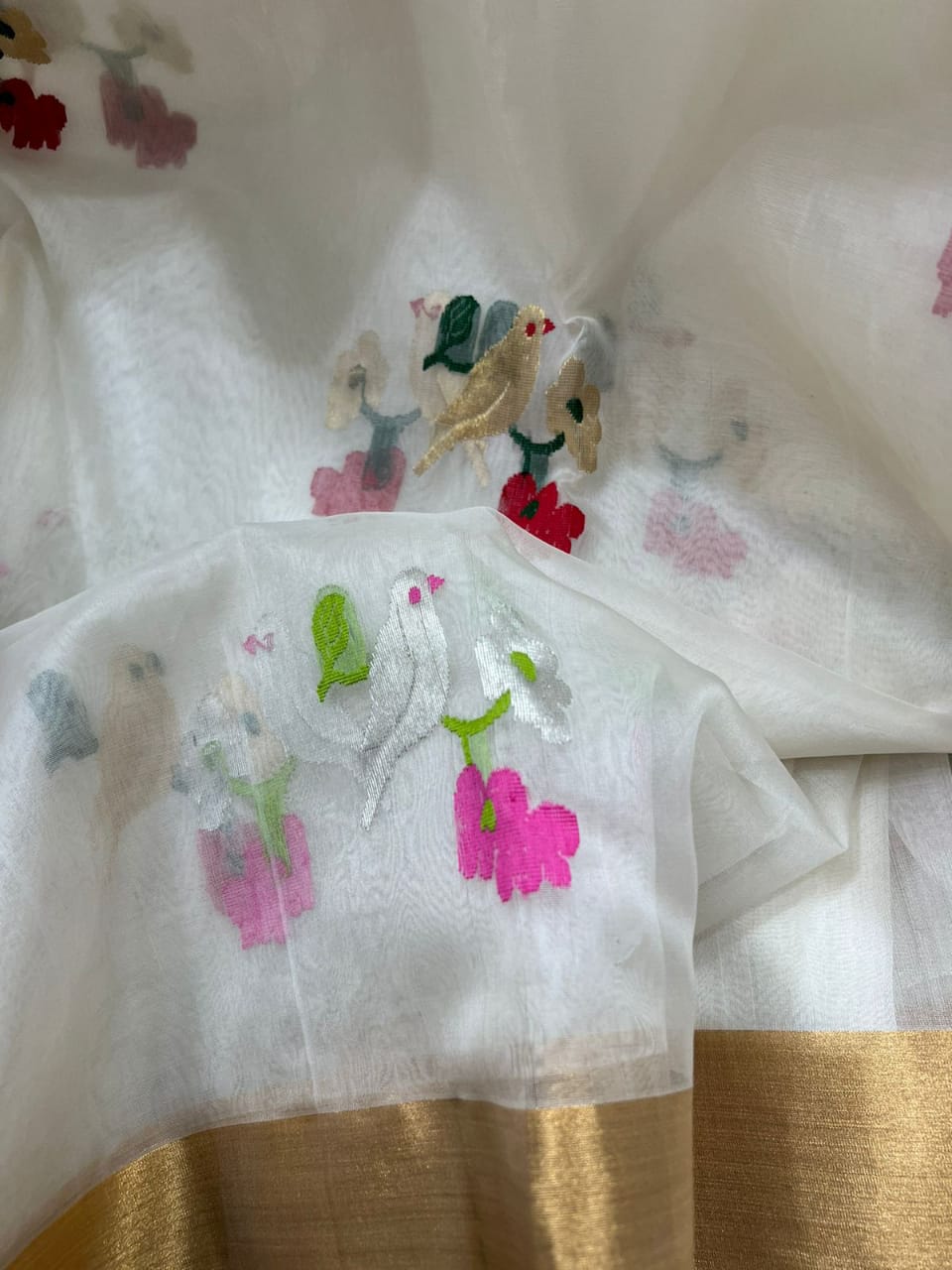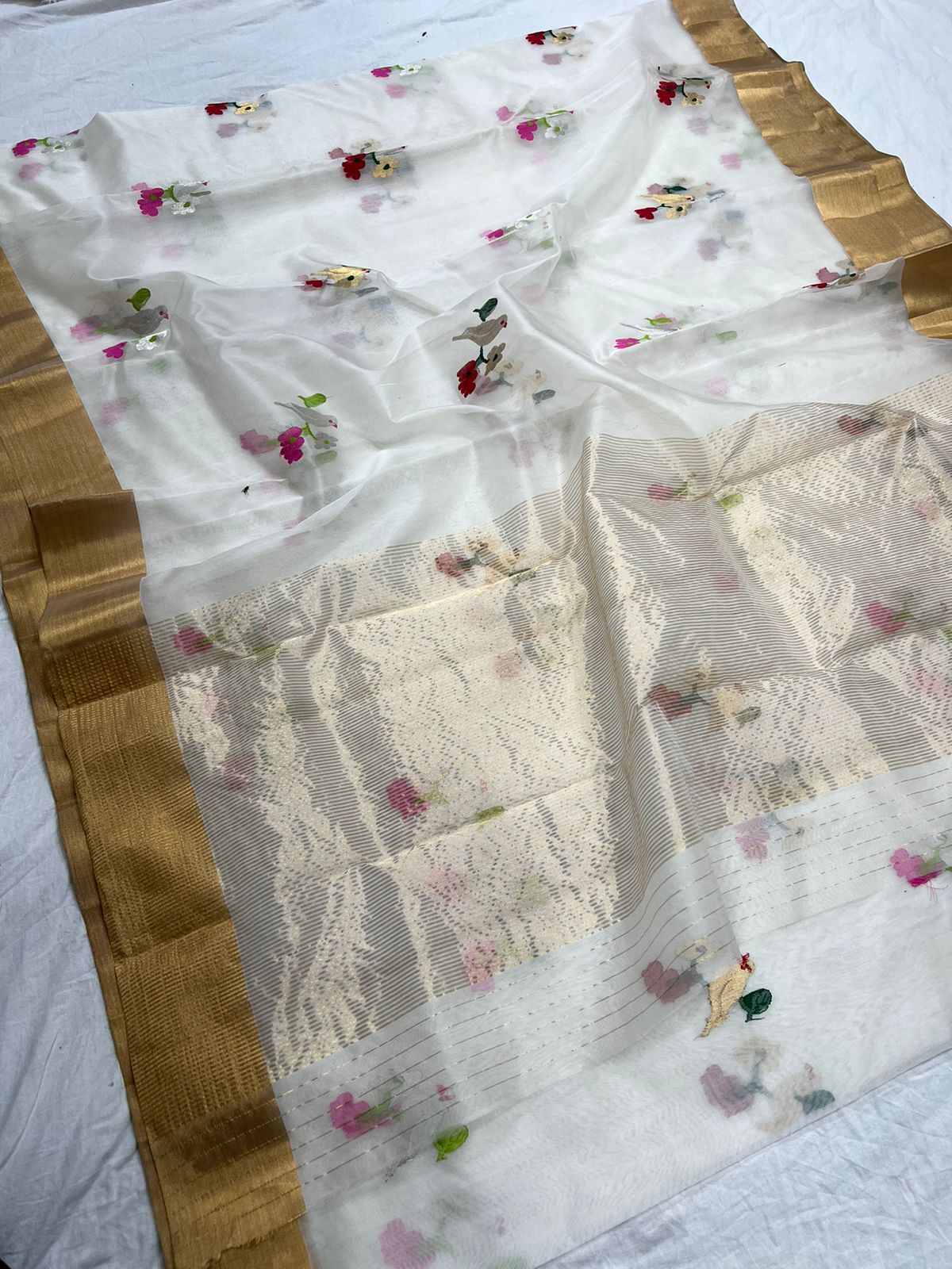 All-over beautiful multicolor meenakari bota work With golden jari solid border & fancy golden Zari srtipe pallu