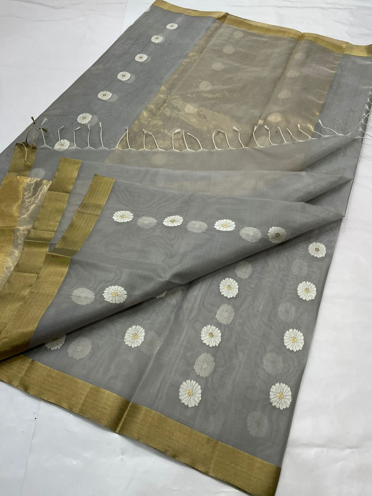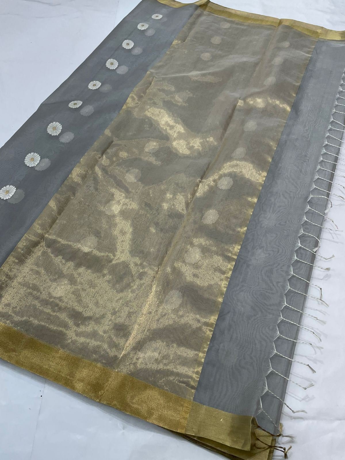 Allover deginer beautiful ghana flower minakari buti motive With golden jari solid border & golden jari beautiful stripe tassel pallu.