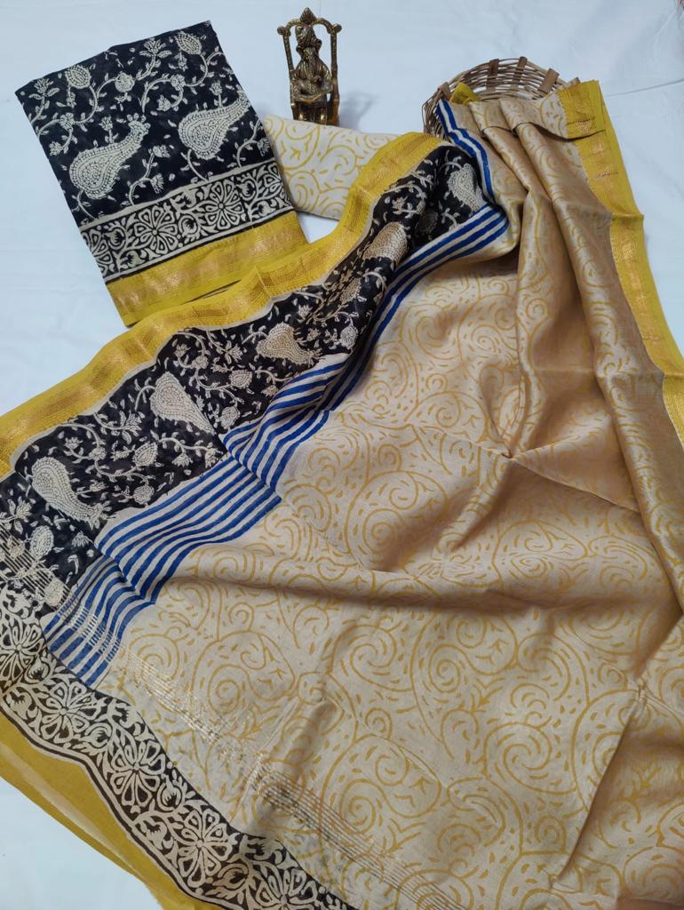 Exclusive New Hand block printed Maheshwari Silk zari border Suits Pieces, Top, Bottom & Dupatta