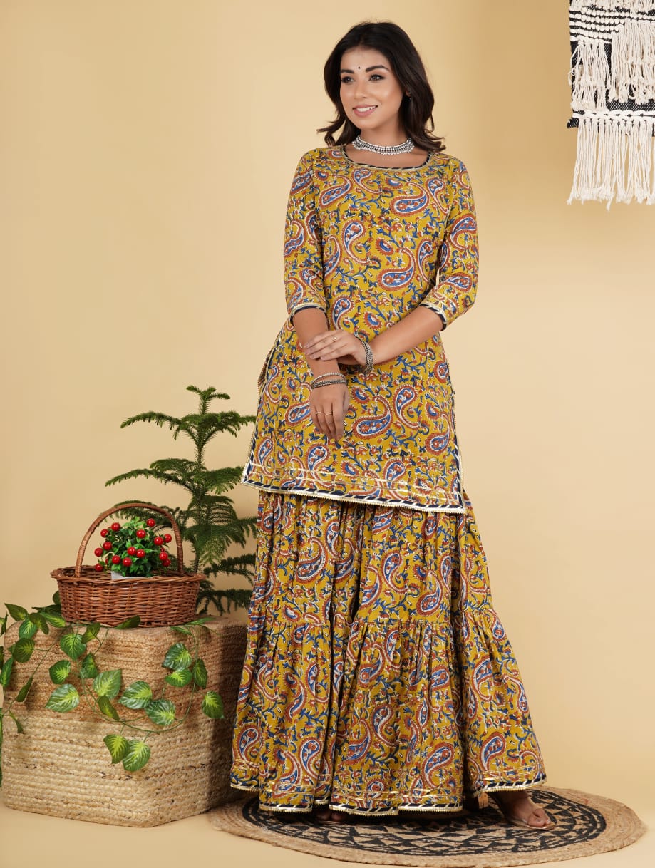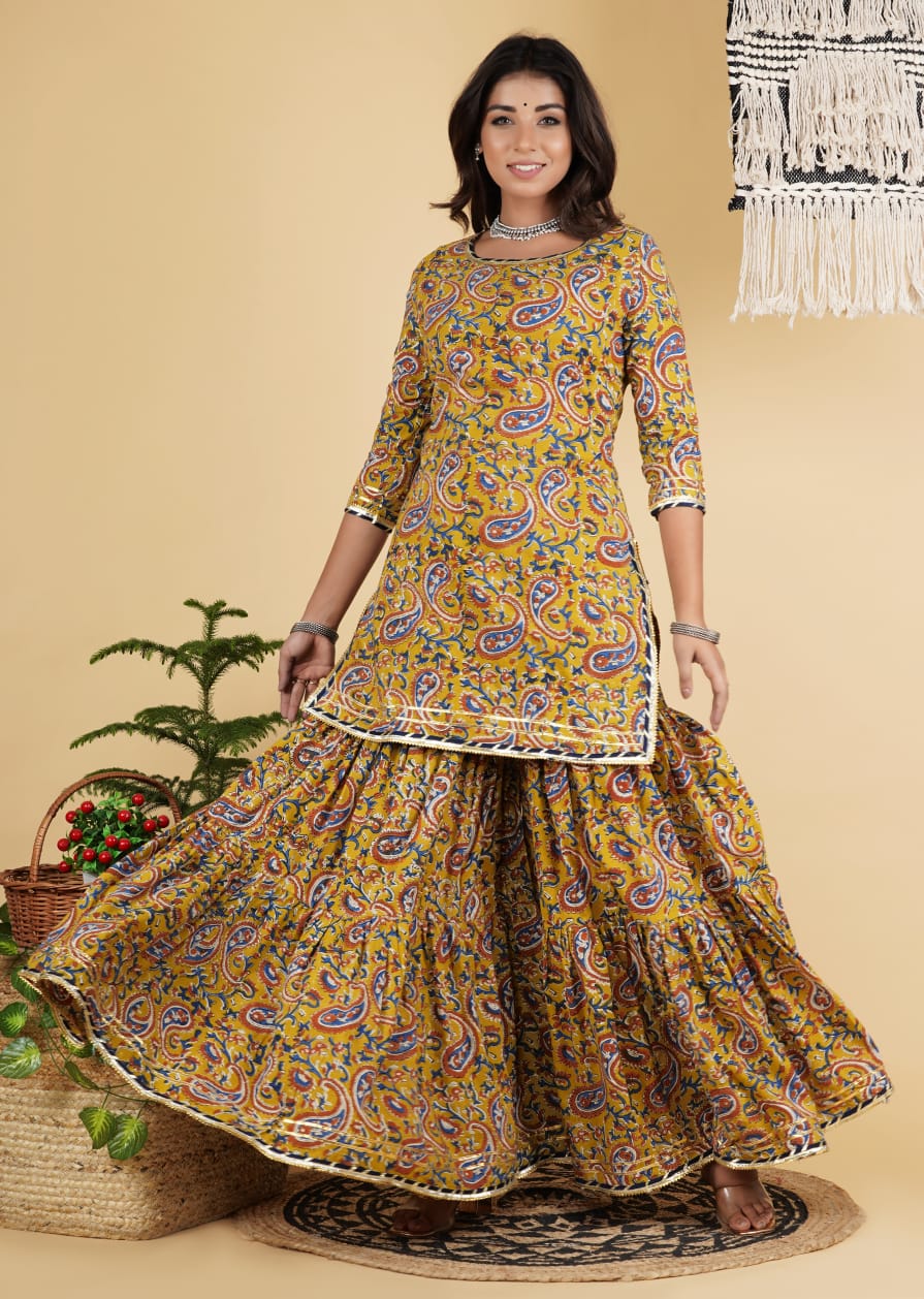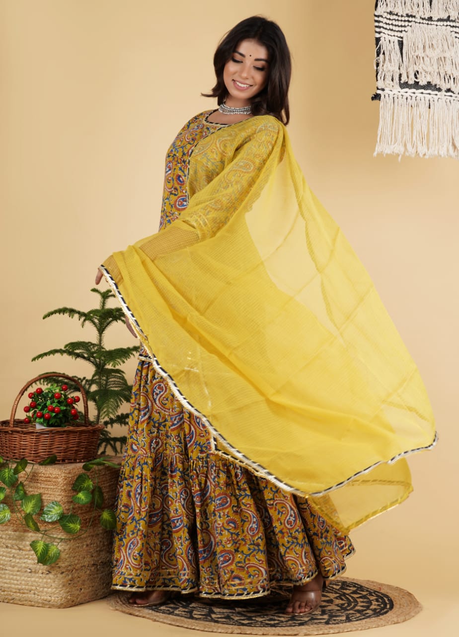 Traditional Hand block print cotton short kurta with tier gharara in a delicate colour palate with Kota doria dupatta with heavy tassel detailing.
