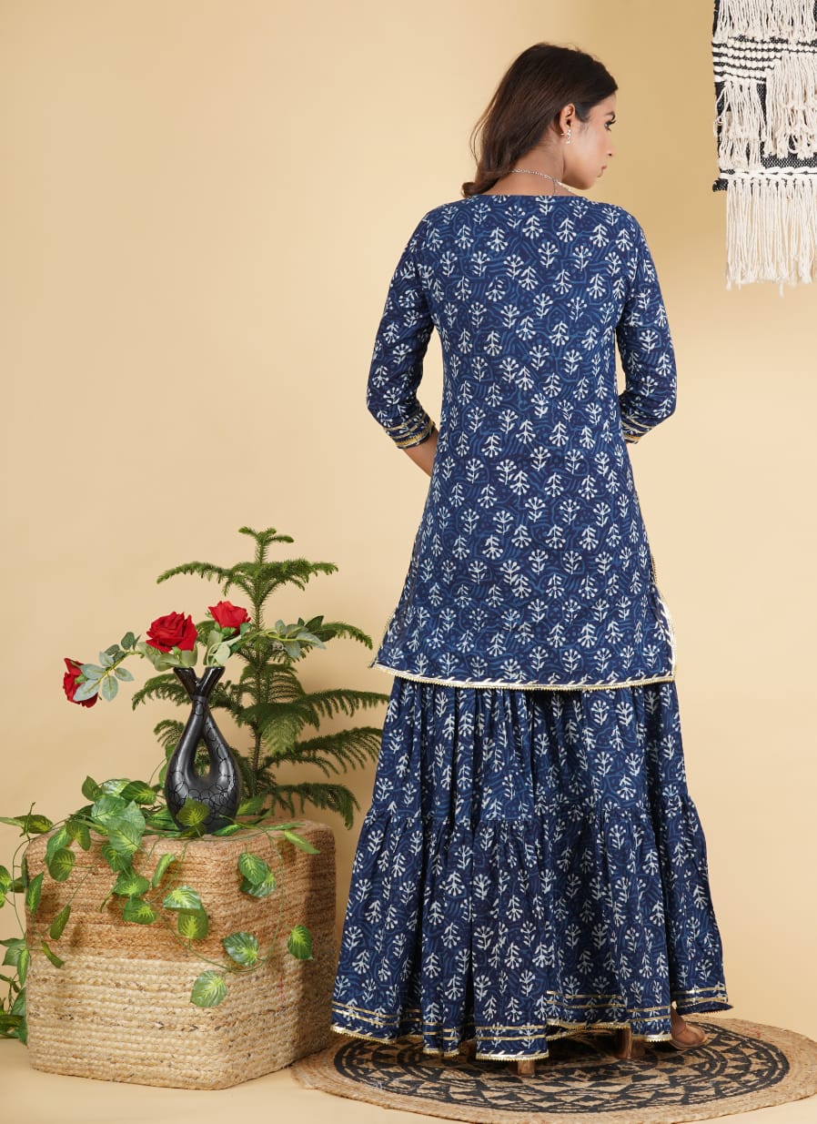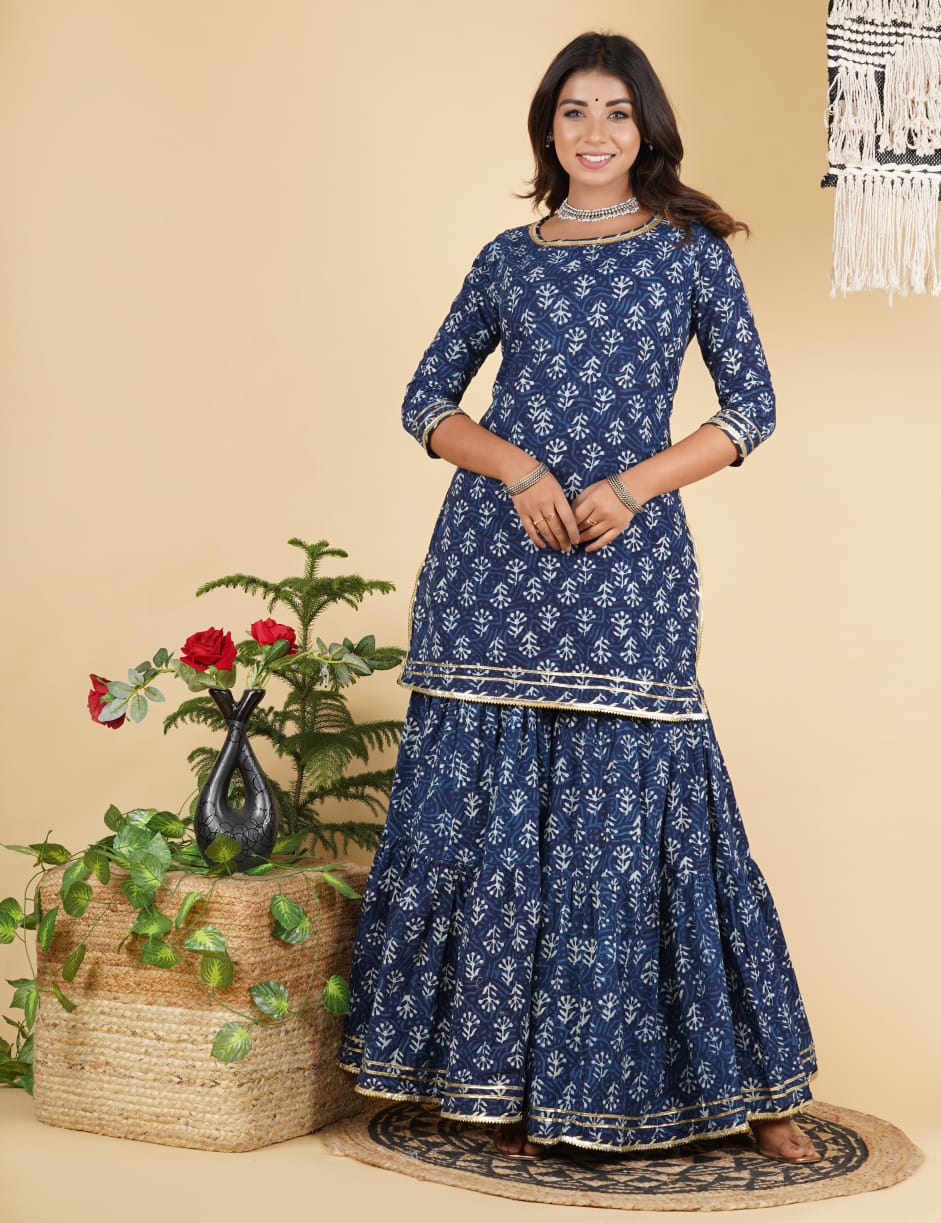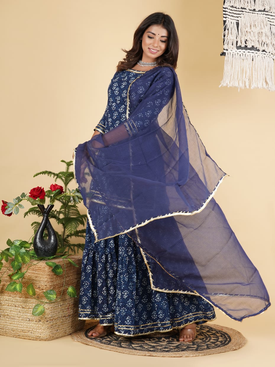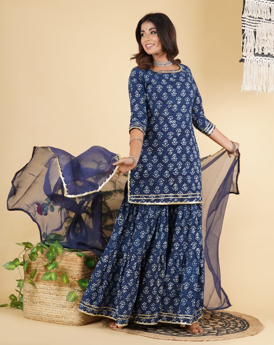 Traditional Hand block print cotton short kurta with tier gharara in a delicate colour palate with Kota doria dupatta with heavy tassel detailing.