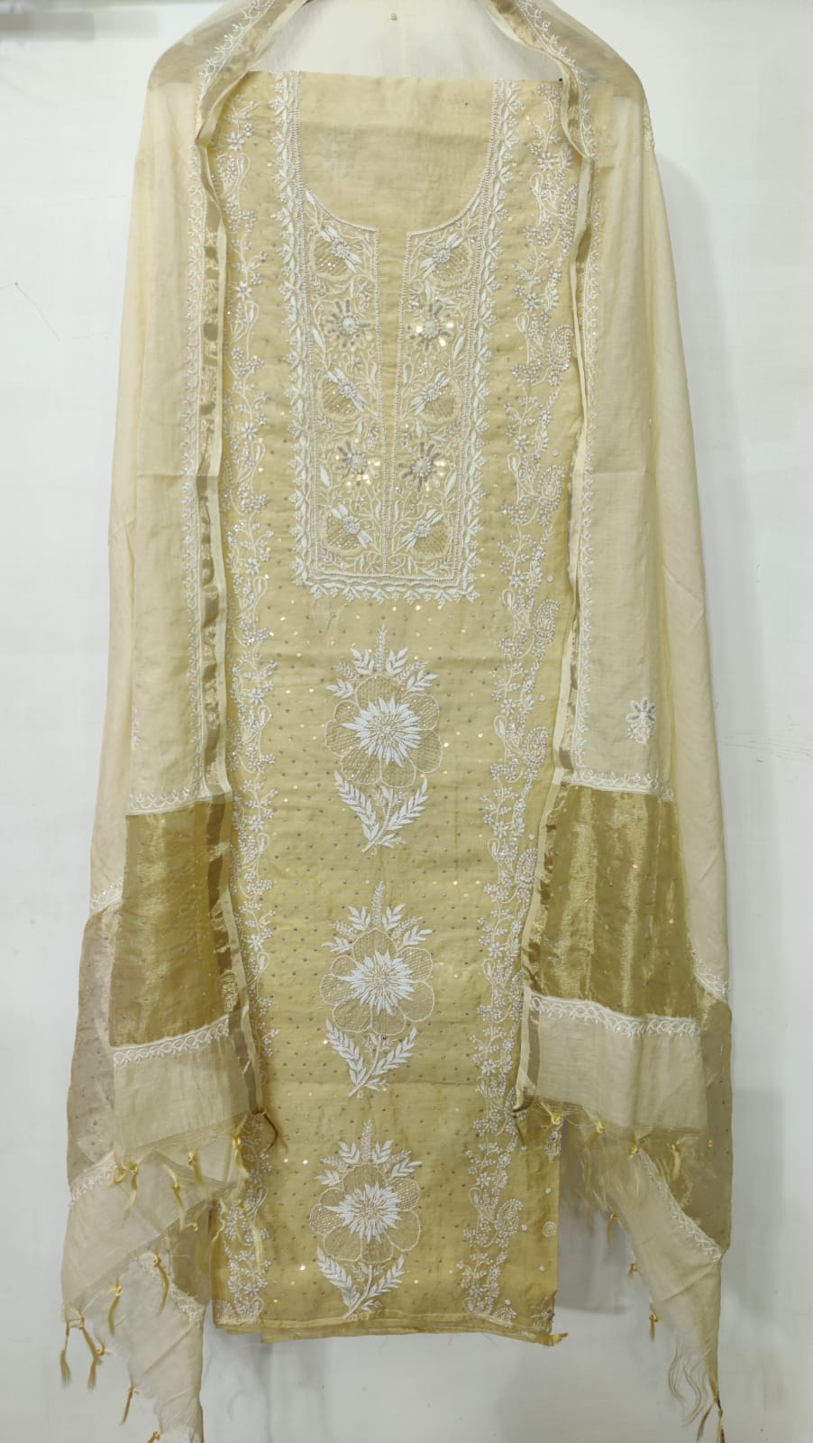 Be the first to review “Golden Chanderi cotton Fabric superfine Chikankari handwork kurta dupatta set heaving intricate Chikankari embroidery” Cancel reply