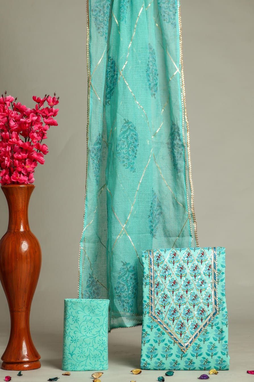 Gotta detailing cotton suits with beautiful work on neck or embroidery on top , With cotton bottom and Pure Kota Doria