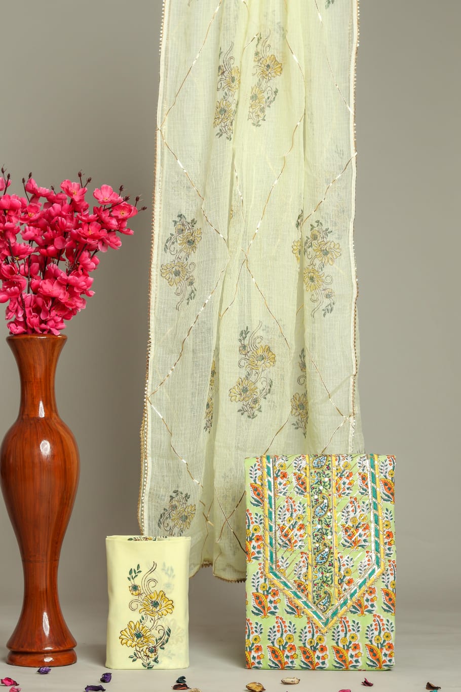 Gotta detailing cotton suits with beautiful work on neck or embroidery on top , With cotton bottom and Pure Kota Doria