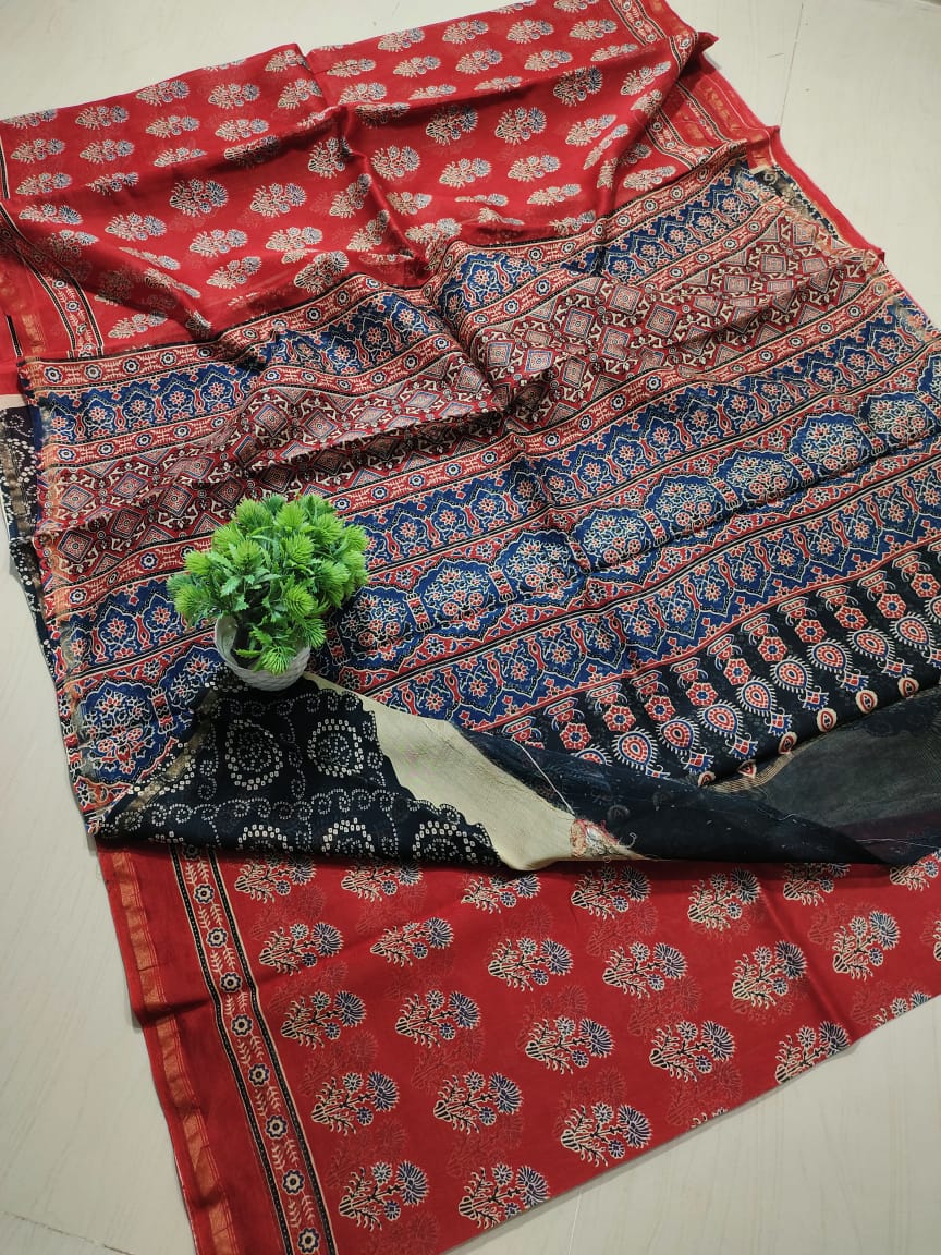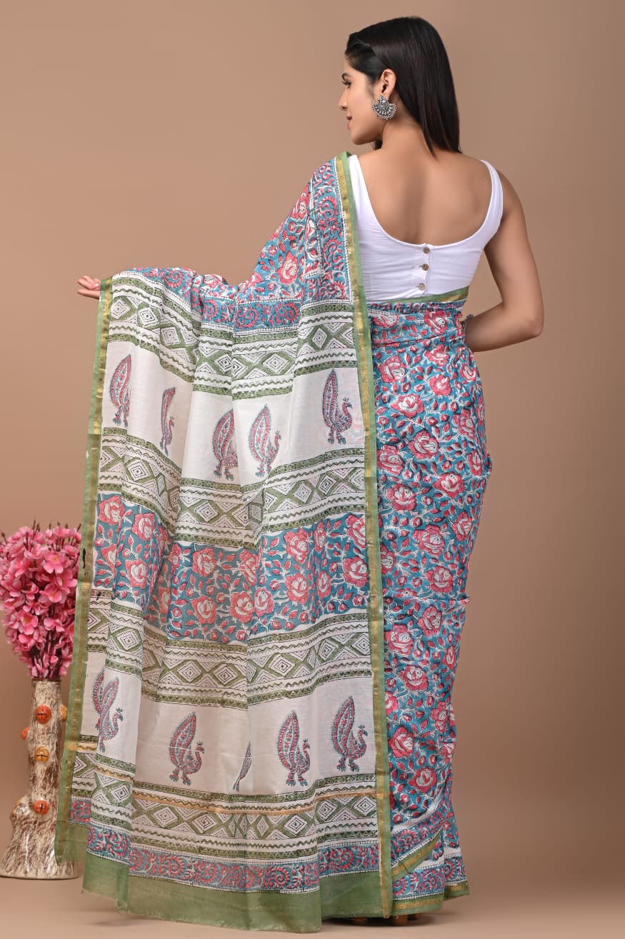 Hand Block printed Cotton chanderi silk Sarees with blouse
