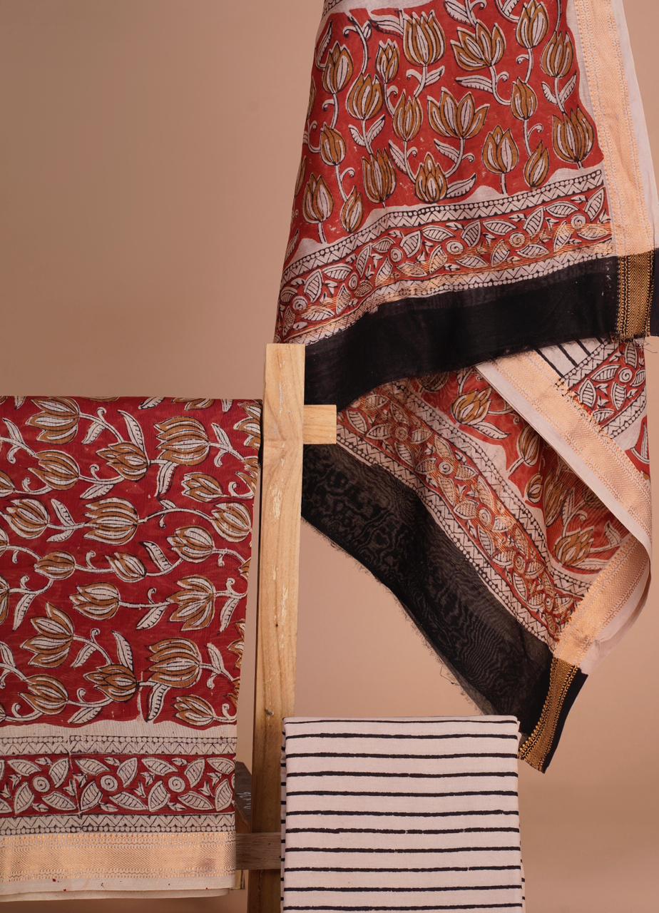 Hand block printed Maheshwari Silk zari border Suits ₹ 4300.00 Original price was: ₹ 4300.00.₹ 3250.00Current price is: ₹ 3250.00.