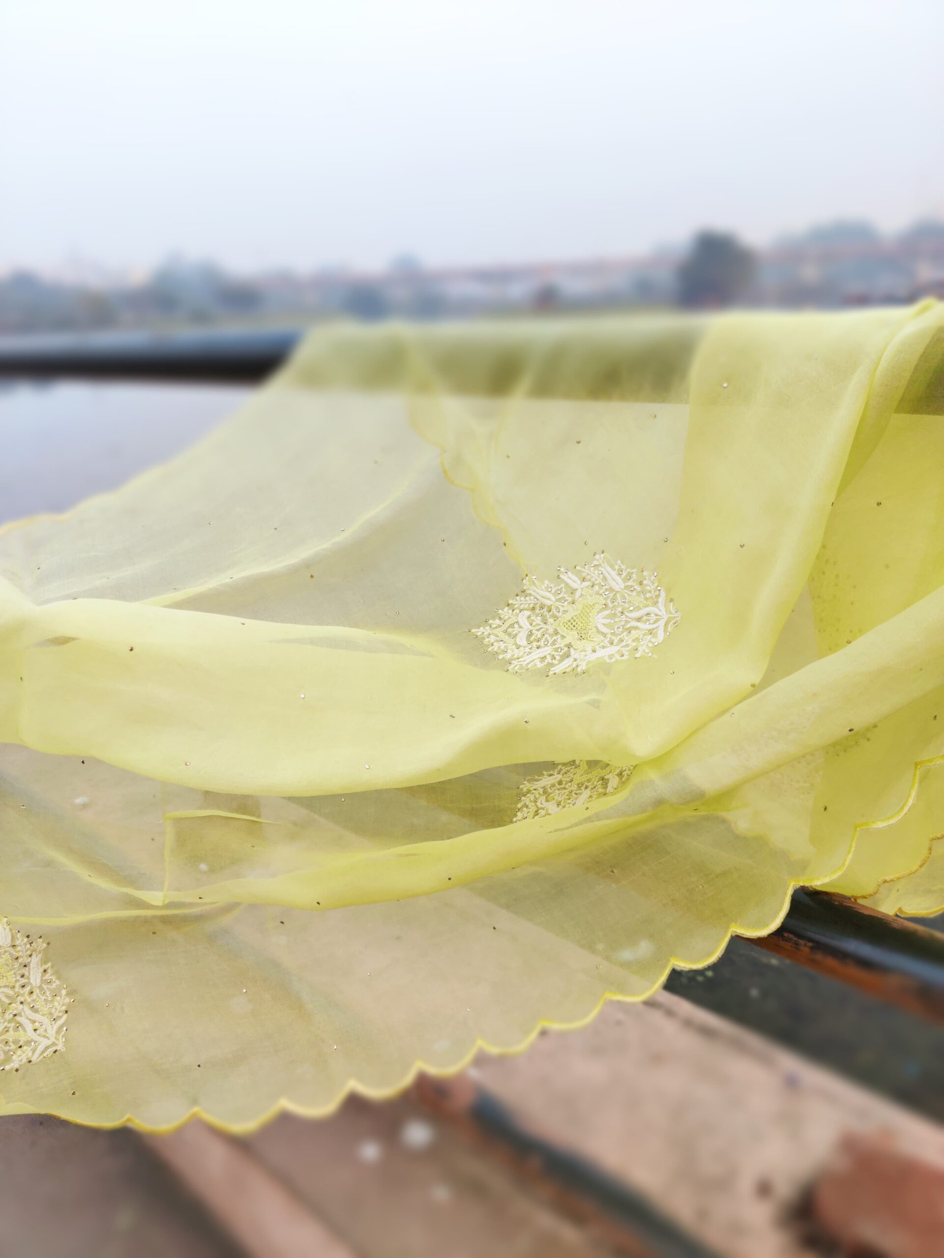Chikankari at its best on Chanderi with organza for all the CHIKANKARI lovers with intricately hand embroidered neck and sleeves and done with Pure Silk organza dupatta has done delicate Mukaish and scallops.