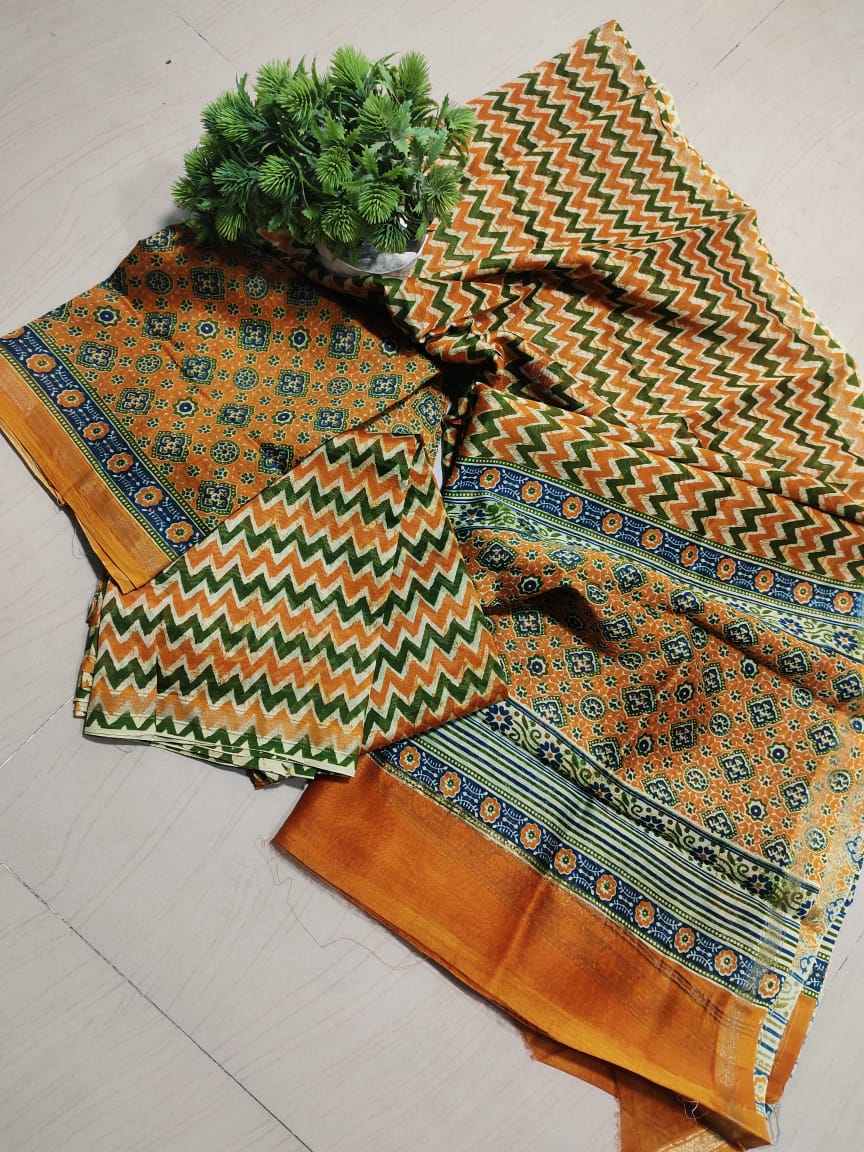 Handblock attractive soft silk Ajrakh print chanderi complete dress material with golden Zari piping border