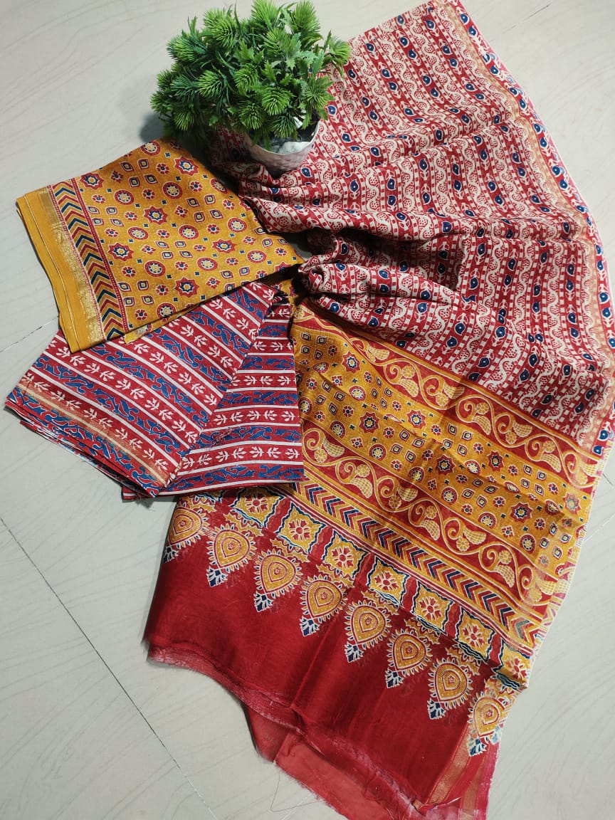 Handblock attractive soft silk Ajrakh print chanderi complete dress material with golden Zari piping border