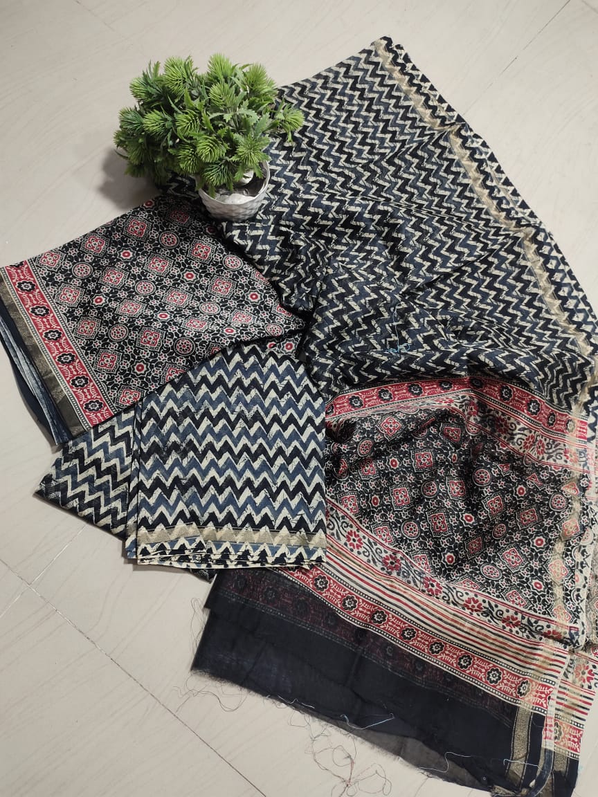 Handblock attractive soft silk Ajrakh print chanderi complete dress material with golden Zari piping border