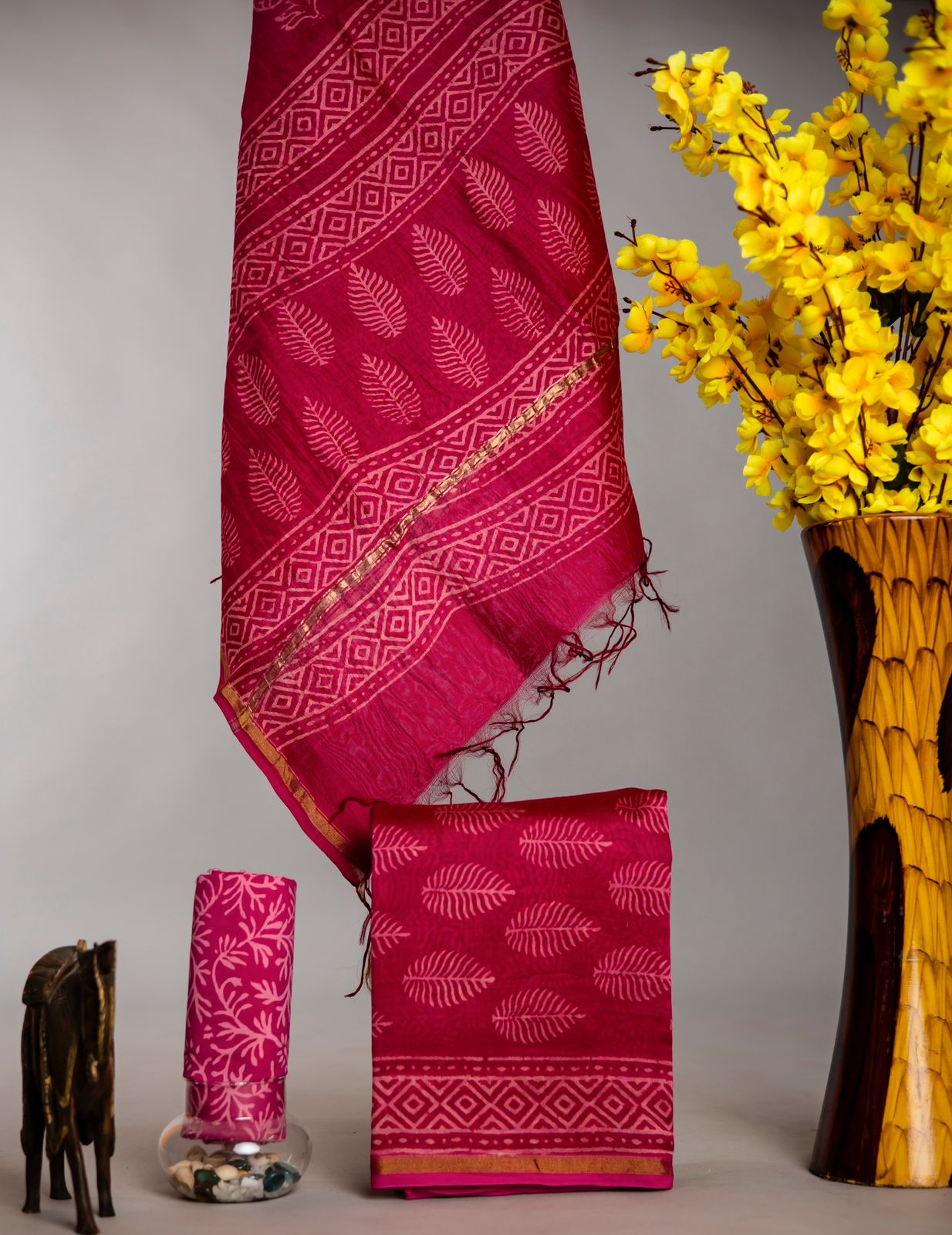 Hand Block Printed Chanderi Silk suit Chanderi Top -2.5 mtr Cotton Bottom 2.5 Mrs Chanderi Dupatta – 2.5 mtr