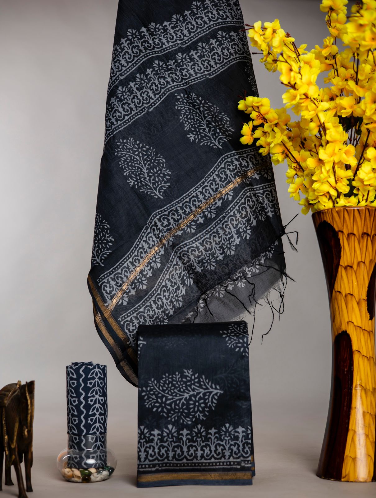 Hand Block Printed Chanderi Silk suit Chanderi Top -2.5 mtr Cotton Bottom 2.5 Mrs Chanderi Dupatta – 2.5 mtr