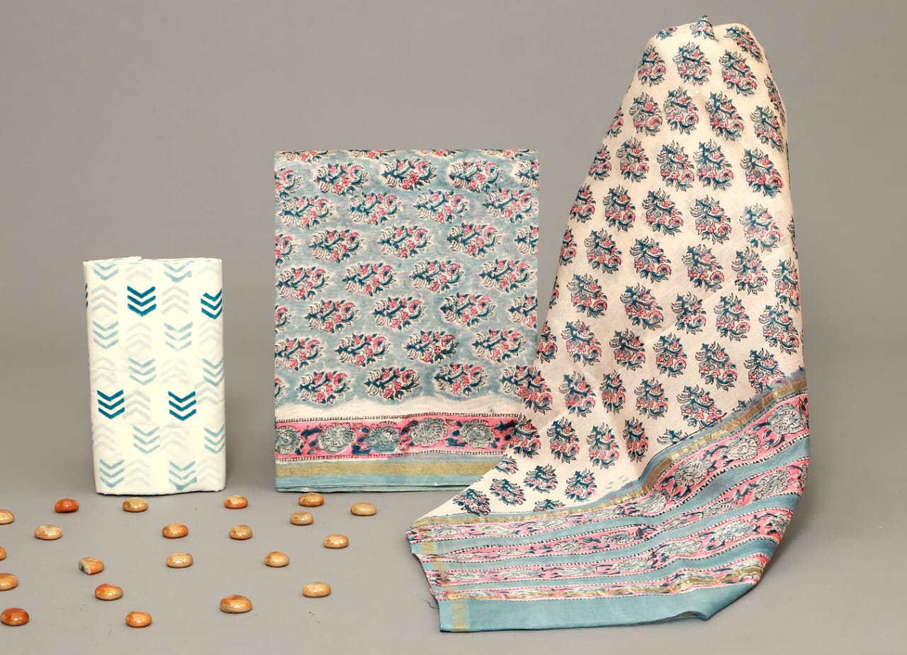Hand Block Printed Chanderi Silk suit Chanderi Top -2.5 mtr Cotton Bottom 2.5 Mrs Chanderi Dupatta – 2.5 mtr